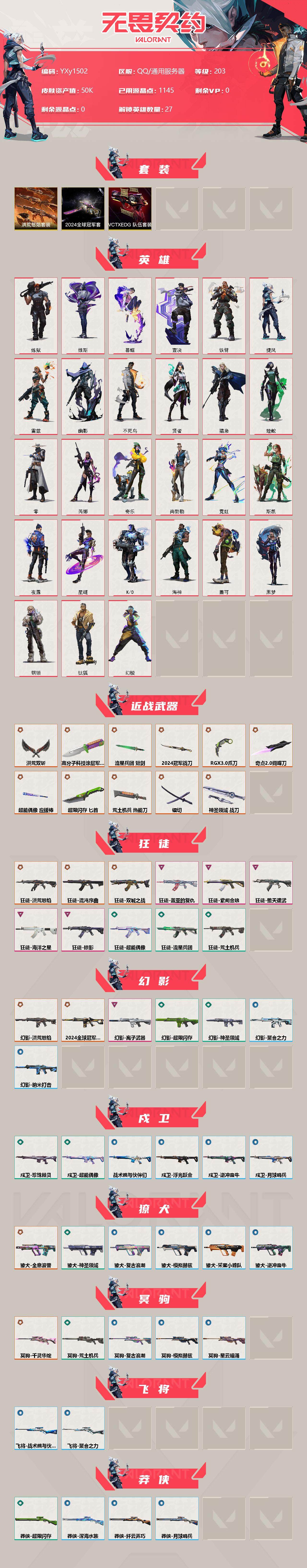 【套装】:2024全球冠军赛套装,洪荒怒焰套装,VCTxEDG 队伍套装 【英雄】:幻棱,炼狱,维斯,暮蝶,钛狐,壹决,铁臂,捷风,雷兹,幽影,不死鸟,贤者,猎枭,蝰蛇,零,芮娜,奇乐,尚勃勒,霓虹,斯凯,夜露,星礈,K/O,海神,盖可,黑梦,钢锁 【近战 武器】:近战武器-2024全球冠军赛 战刀,近战武器-奇点//2.0 蝴蝶刀,近战武器-RGX 11z Pro//3.0 爪刀,近战武器-镭切,近战武器-流星兵团 短剑,近战武器-超能偶像 应援棒,近战武器-超限闪存 匕首,近战武器-高分子科技涂层军刀,近战武器-洪荒双斩,近战武器-荒土机兵 热能刀,近战武器-神圣领域 战刀 【狂徒】:狂徒-洪荒怒焰,狂徒-混沌序曲,狂徒-双城之战,狂徒-堕天遗武,狂徒-掠影,狂徒-盖亚的复仇,狂徒-海洋之星,狂徒-紫阙金琅,狂徒-超能偶像,狂徒-荒土机兵,狂徒-流星兵团 【幻影】:幻影-2024全球冠军赛,幻影-洪荒怒焰,幻影-离子武器,幻影-超限闪存,幻影-神圣领域,幻影-聚合之力,幻影-纳米 【戍卫】:戍卫-超能偶像,戍卫-珍珠棘贝,戍卫-浮光跃金,戍卫-逆冲蛮牛,戍卫-战术熊与伙伴们,戍卫-月球哨兵 【獠犬】:獠犬-全息波普,獠犬-神圣领域,獠犬-采蜜小蜂队,獠犬-复古浪潮,獠犬-模拟赫兹,獠犬-逆冲蛮牛 【冥驹】:冥驹-千灵华绽,冥驹-荒土机兵,冥驹-复古浪潮,冥驹-模拟赫兹,冥驹-星云暗涌 【飞将】:飞将-聚合之力,飞将-战术熊与伙伴们 【莽侠】:莽侠-超限闪存,莽侠-深海水族,莽侠-纤云弄巧,莽侠-月球哨兵 【战神】:战神-光明哨兵,战神-神圣领域,战神-采蜜小蜂队,战神-浮光跃金,战神-深海水族 【奥丁】:奥丁-流星兵团,奥丁-纳米 【判官】:判官-超能偶像,判官-采蜜小蜂队,判官-纳米x 【雄鹿】:雄鹿-复古浪潮,雄鹿-模拟赫兹,雄鹿-逆冲蛮牛,雄鹿-月球哨兵 【骇灵】:骇灵-洪荒怒焰,骇灵-荒土机兵,骇灵-流星兵团,骇灵-珍珠棘贝,骇灵-浮光跃金,骇灵-星云暗涌 【蜂刺】:蜂刺-超限闪存,蜂刺-聚合之力,蜂刺-深海水族,蜂刺-纤云弄巧,蜂刺-星云暗涌 【标配】:标配-超能偶像,标配-荒土机兵,标配-浮光跃金,标配-战术熊与伙伴们 【VCT手枪】:标配-VCT x EDG 【正义】:正义-奇点,正义-西部未来,正义-超限闪存,正义-纳米,正义-纤云弄巧,正义-月球哨兵 【鬼魅】:鬼魅-破败军械,鬼魅-流星兵团,鬼魅-采蜜小蜂队,鬼魅-模拟赫兹,鬼魅-星云暗涌 【狂怒】:狂怒-珍珠棘贝,狂怒-神圣领域,狂怒-聚合之力,狂怒-逆冲蛮牛,狂怒-战术熊与伙伴们 【短炮】:短炮-洪荒怒焰,短炮-深海水族,短炮-纤云弄巧 【卡面】:终章:激斗汉堡 卡面,进入射程 卡面,分崩离析 卡面,纳米 卡面,抑制技术 卡面,激斗汉堡 卡面,瓦娃雪糕 P2 卡面,从黄昏到黎明 卡面,荒土机兵 卡面,银弹猎手 卡面,逆冲蛮牛 卡面,《双城之战》拥抱 卡面,精灵大战 卡面,欢迎来到底城 卡面,南瓜盛典 卡面,VCT CN首冠 卡面,唱片的故事 卡面,钢弓与箭弦 卡面,无畏契约:暮蝶 卡面,排除故障 卡面,战术桌游 卡面,悠享食光 卡面,修车达人 卡面,热舞环节 卡面,模拟赫兹 卡面,浮光跃金 卡面,超限闪存 卡面,维斯工牌 卡面,正义的化身 卡面,终章:生意人麦宝 卡面,铁之华 卡面,2024全球冠军赛 卡面,失而复得 卡面,时间到 卡面,最高舞台 卡面,复活专家 卡面,归乡 // 蝰蛇 卡面,超能偶像 卡面,生意人麦宝 卡面,音熊登场 卡面,树懒大作战 卡面,声感陷阱设计图 卡面,红鳞松叶 卡面,Clutch 卡面,霓帧牛蛙 卡面,钢锁工牌 卡面,战术小伙伴的夏日 卡面,采蜜小蜂队 卡面,聚合之力 卡面,梦幻奶茶 卡面,终章:打造专属狂徒 卡面,趁热吃 卡面,西装暴徒 卡面,失控边缘 卡面,哨卫者之领域 卡面,暮蝶工牌 卡面,战术熊与伙伴们 卡面,源能反应 卡面,流星兵团 卡面,纤云弄巧 卡面,暂别喧嚣 卡面,打造专属狂徒 卡面,零点嗅探设计图 卡面,源能者美容 卡面,脚踝终结者 卡面 ,夜班 卡面,瓦娃雪糕 卡面 ,沙雕爆能器 卡面,无畏契约GO!卷:芮娜 卡面,深海水族 卡面,珍珠棘贝 卡面,复古浪潮 卡面,盖可工牌 卡面,清除名单 卡面,无畏契约GO!卷:零 卡面,无垠星环 卡面,先瓦为敬 - 绿色 卡面,《双城之战》金克丝 卡面,暗枪 卡面,无畏契约GO!卷:贤者 卡面,钢锁vs盖可 卡面,别冒尖 卡面,代号红色 卡面,新兵报到 卡面,V契约 卡面,无畏契约 卡面 【喷漆】:小小心意 喷漆,战“素”兔 喷漆,宇宙的指引 喷漆,请求重启 喷漆,逆冲蛮牛 喷漆,纳米 喷漆,鼻尖上的蝴蝶 喷漆,简笔画黯兽 喷漆,独守蝰腹 喷漆,他们将落荒而逃 喷漆,通缉:战术 喷漆,荒土机兵 喷漆,别挡我吃球! 喷漆,嗨宝南瓜灯 喷漆,嘭! 喷漆,都算到了 喷漆,控场勿近 喷漆,皮蛋呼呼 喷漆,像素星礈 喷漆,图谋不轨的零 喷漆,伤心心 喷漆,小丑猫 喷漆,模拟赫兹 喷漆,高丽风情小熊 喷漆,蹲到一个 喷漆,全力集中 喷漆,超限闪存 喷漆,RUA一下 喷漆,熊抱 喷漆,蛋糕还是爆能器? 喷漆,高丽风情小虎 喷漆,记在小本本 喷漆,防弹 喷漆,高丽风情小蛙 喷漆,2024全球冠军赛 喷漆,又被闪了 喷漆,终极羞辱 喷漆,超级粉丝 喷漆,黯兽卖萌 喷漆,捷风差距 喷漆,惊声尖叫 喷漆,水晶球 喷漆,2021冠军巡回赛花火 喷漆,五人成星 喷漆,超能偶像 喷漆,放我出去 喷漆,战术熊的巴拉莱卡琴 喷漆,审判之爪 喷漆,掩护我 喷漆,大佬发枪 喷漆,边缘试探 喷漆,拼一枪 喷漆,聚合之力 喷漆,采蜜小蜂队 喷漆,梦幻小队 喷漆,五个全都齐了 喷漆,加油!加油! 喷漆,开心到爆炸 喷漆,皮蛋萌舞 喷漆,我觉得不行 喷漆,头号粉丝 喷漆,吸一口快乐 喷漆,永远的答案 