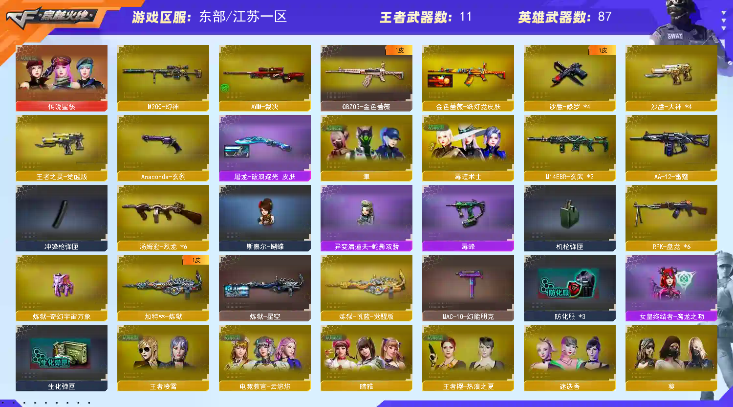 生化天花板✅传说星骇+6烈龙蝴蝶+6盘龙泡泡象+炽芒蝶刃✅幻神+QBZ+火麒麟4皮音效卡 稀有武器:M200幻神、6把烈龙+、6把盘龙+2炼狱(星空皮肤)、炽芒蝶刃、QBZ金色蔷薇(纸灯龙皮肤)、QBZ天罚、M4青龙、M14玄武、千变、火麒麟(火麒麟音效卡、心动糖果皮肤、平天大圣皮肤、CFstar皮肤、AG战队皮肤)、黑龙(暗月皮肤)、雷神(能量核心皮肤)、黑骑士、黑武士、黑鲨、龙血、无影神兵利器、黑武士锦绣游龙、超新星热带奇洋、机械迷城穹宇、玫瑰精灵、猎神、烈火动感闪耀、黑骑士海王、天龙、毁灭、裁决、Barrett金色蔷薇、烈龙云海游龙、A12雷霆、修罗X4(能量核心皮肤、CFstar皮肤)、天神X4、天神动感闪耀、Ana玄豹、屠龙X3、龙啸、擎天、麒麟刺、麒麟刺堕天神、龙啸堕天神X2、屠龙动感闪耀、擎天云海游龙、龙啸热带奇洋、冰龙粉碎者白马银枪、黑龙吞噬者、神圣爆裂者末日3、巡航者、MAC10涂鸦 稀有角色:传说星骇(四防:挑战背包+觉醒肾上腺素+挑战暴走时间提升+防爆盾)、电竞教官云悠悠、毒蝰术士(四防:生化背包变更+佣兵觉醒无需换弹+移动速度提升+生化觉醒狂暴化)、机械姬、葵、迷迭香、晴雅、樱、魅影、奇洋探员、乔伊教练、蛇影宗、王者瞳闭月羞花、王者凌霄、王者樱热浪之夏、云海玲珑 王者炫金武器:王者之戮觉醒、王者之幻觉醒、王者之怒觉醒、王者之灵觉醒、王者冰峰觉醒、王者之魄X2、炫金骑士、蔷薇青龙、炫金毁灭、 投掷套装:堕天神套X4、手雷动感闪耀、手雷云海游龙、手雷热带奇洋、音乐手雷X2 小人枪武器特殊武器:火麒麟灵狐、炼狱奇幻宇宙象、迷你宝贝、迷你钢铁终结者、迷你救赎猎手、MK5炽火炎龙、毒蜂、异变清道夫蛇影双骄、迷你律动酷熊、斯太尔蝴蝶、跳跳鲨、C.A.T、M37葵、COP旗袍、迷你生化手雷X4;炽芒蝶刃,传说星骇,隼,电竞教官-云悠悠,晴雅,RPK-盘龙,QBZ03-金色蔷薇,