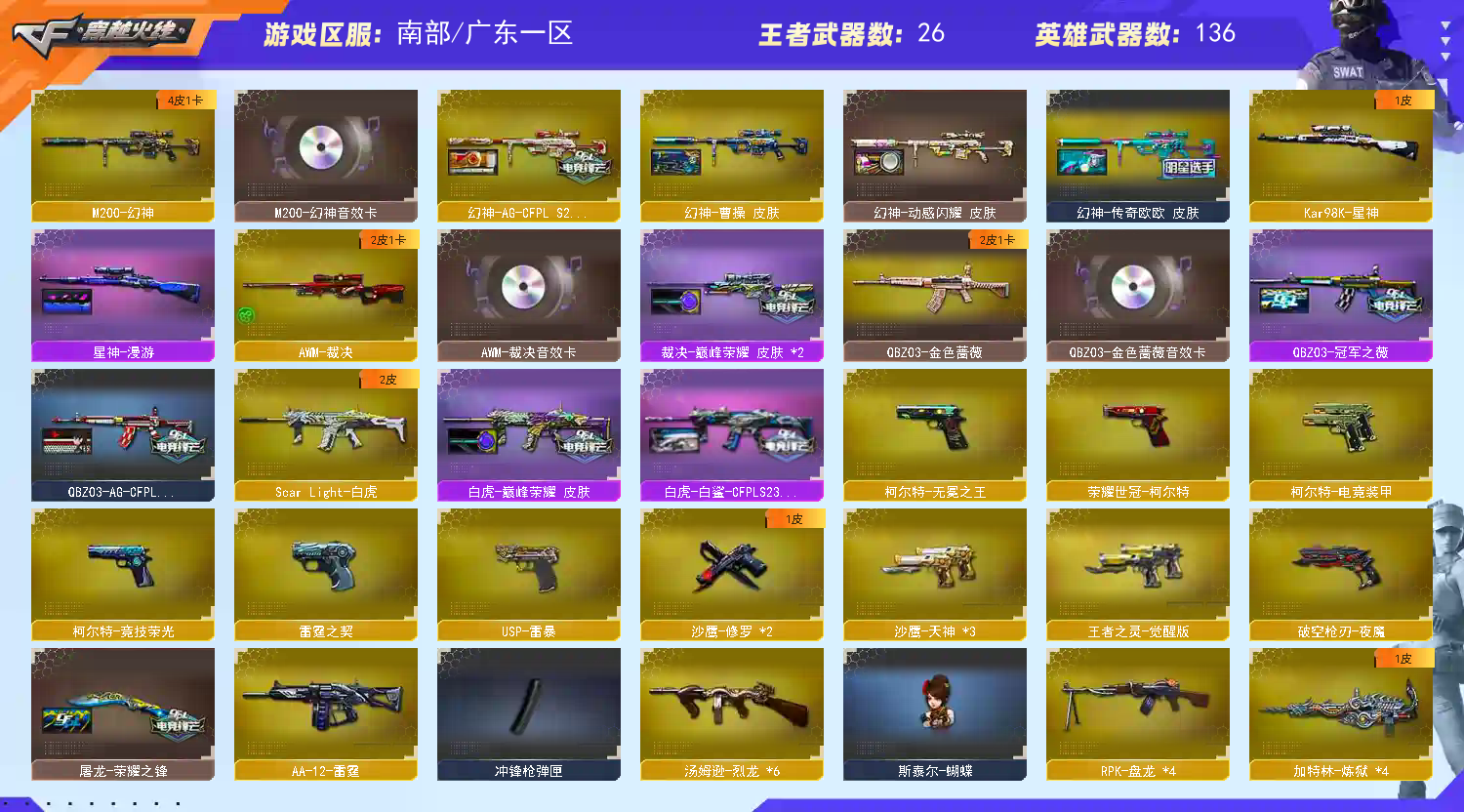 南部爆破生化号⚡️幻神4皮带音效+星神+漫游皮+6盘6烈+炼狱小刚+蝴蝶+usp雷暴+qbz两皮带卡;USP-雷暴,柯尔特-无冕之王,荣耀世冠-柯尔特,电竞教官-云悠悠,RPK-盘龙,QBZ03-金色蔷薇,M200-幻神,