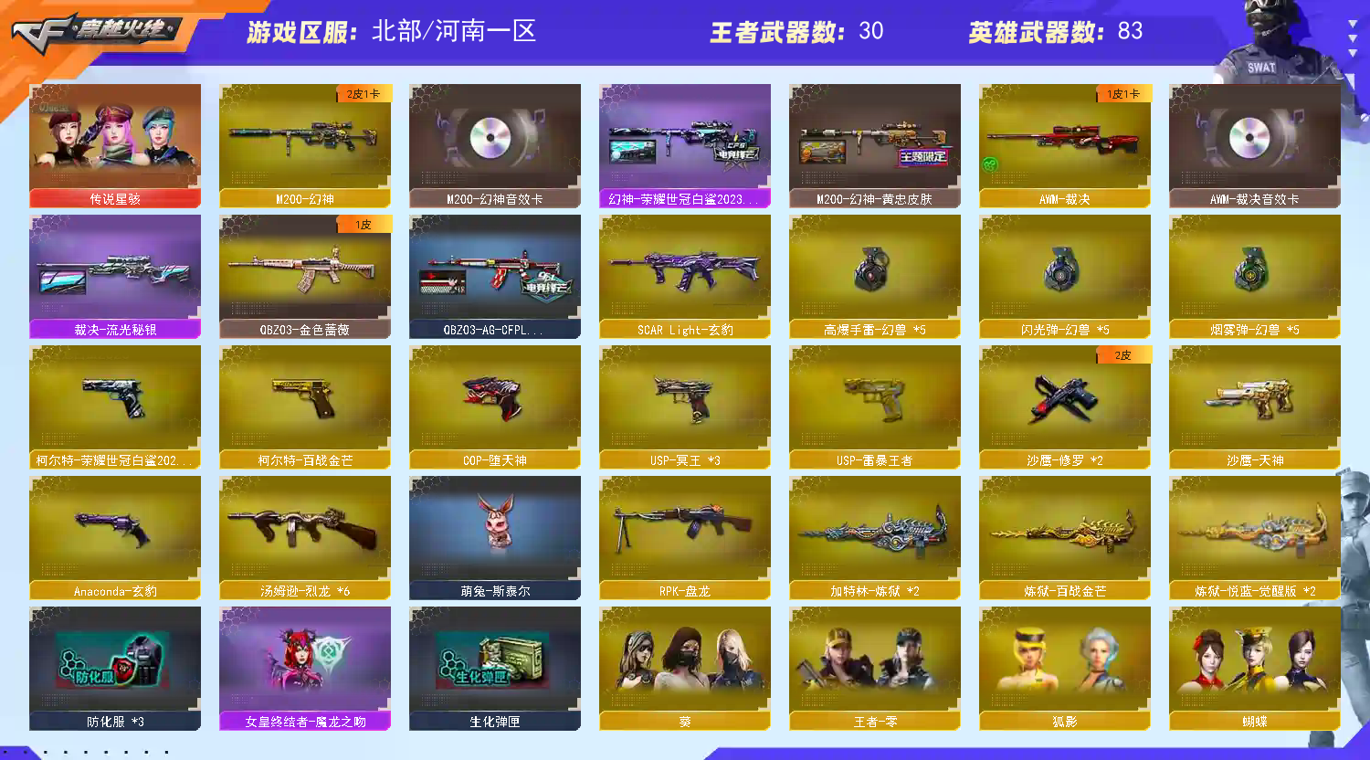 【温馨提示】此号价值数十万,已向公安机关报备,如有开G开辅助封号的,由平台提供,身份信息证据和地址进行报警处理并依法追究.账号开挂追责 后台看的一清二楚!!!! 不要有侥幸心理 开挂是犯罪行为!!!!恶意撤单退排位永久拉黑 5幻兽套⭐️百战金芒柯尔特 3usp冥王 usp雷暴王者 裁决三件套音效卡 幻神三件套 王者凌虎 玄豹白虎 流光秘银 王者冰锋 传说星骇 雷暴王者套 玄豹套 1911柯尔特;USP-雷暴王者,柯尔特-荣耀世冠白鲨2023,传说星骇,RPK-盘龙,QBZ03-金色蔷薇,M200-幻神,