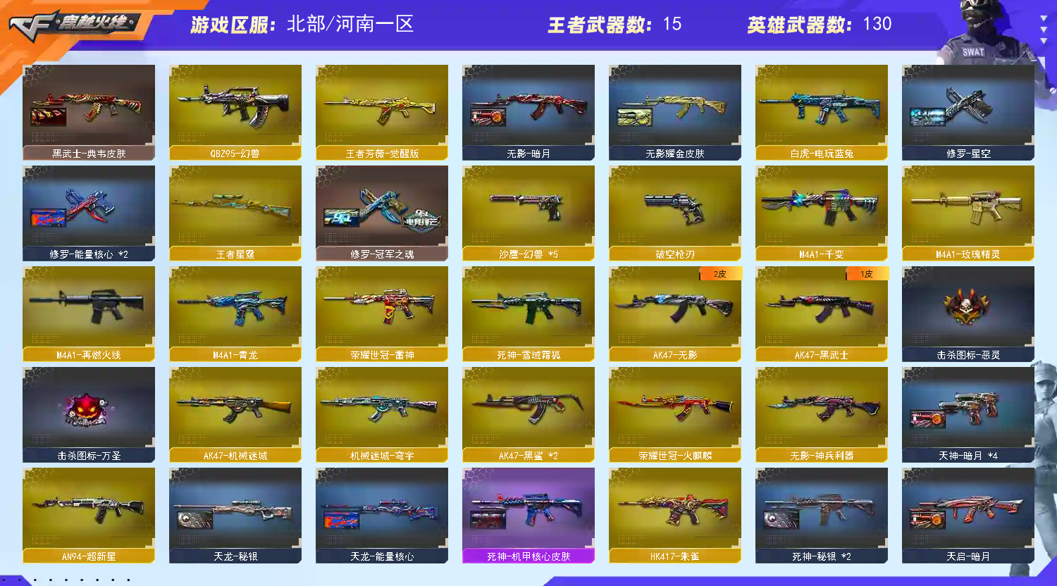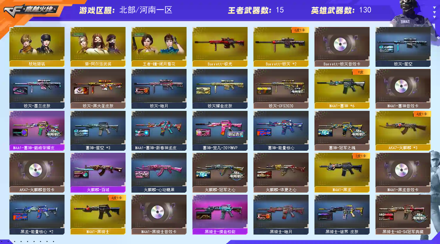 首页 > 租号大厅 > 穿越火线 > 网通区/河南一区 > 幻兽5套玄豹套冥王套星骇灵眸G36蝶刃幻神欧欧宠儿5皮音10手枪裁决套白虎套蔷薇套星神