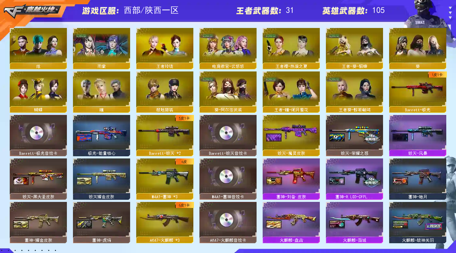 首页 > 租号大厅 > 穿越火线 > 电信区/陕西一区 > 1️⃣5套幻兽⚡幻神3皮⚡裁决三件套⚡星神带皮⚡白虎天戎6盘6烈蝴蝶⚡7把质量副武器