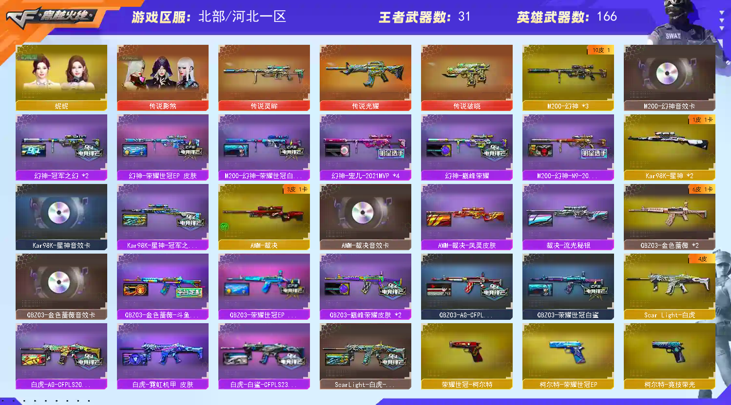 150豆♥白虎白鲨秘银裁决音效影煞灵眸宠儿③幻神⑨皮音效冠军白虎星神音效斗鱼QBZ♥手枪顶配炽芒蝶刃;USP-雷暴,荣耀世冠-柯尔特,柯尔特-冠军之特,炽芒蝶刃,Knife-冠军之刃,传说影煞,电竞教官-云悠悠,