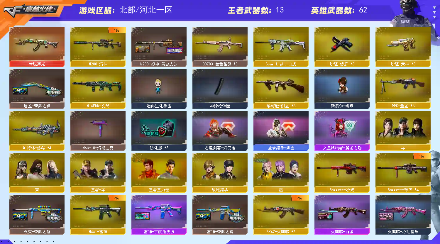 幻神黄忠✨6盘6烈蝴蝶✨传说辉光✨王者星神✨金色蔷薇✨雷神✨王者之啸✨黄金迷你裂空翼✨黄金迷你冰龙;RPK-盘龙,QBZ03-金色蔷薇,M200-幻神,Scar Light-白虎,