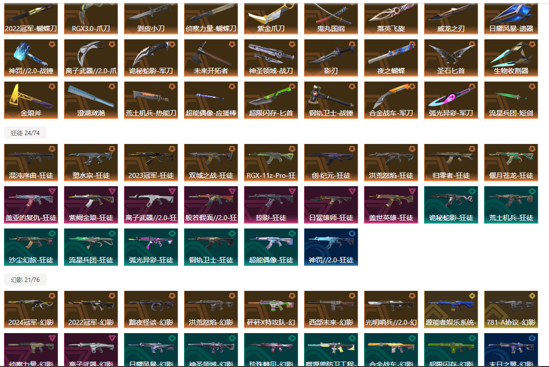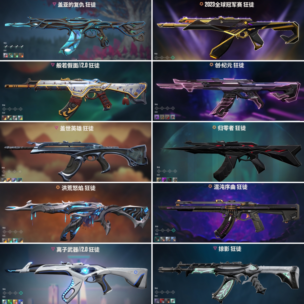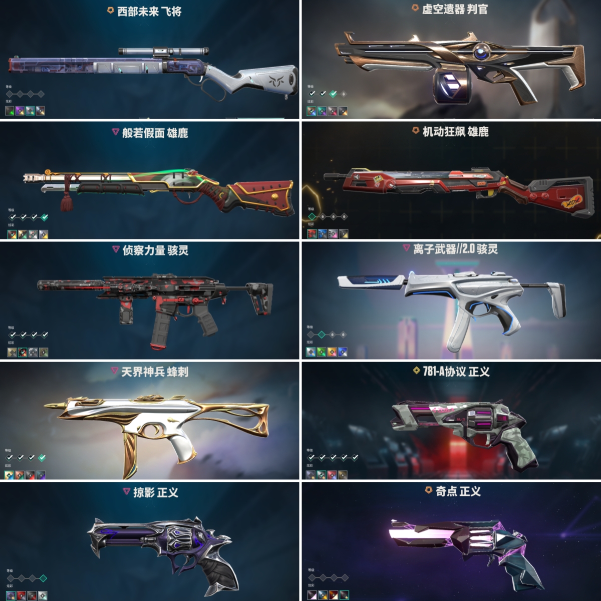 【拥有手枪】VCT-x-PRX-标配,双城之战-正义,砰砰X特攻队-狂怒,奇点-正义,781-A协议-正义,天界神兵-鬼魅,盖亚的复仇-鬼魅,星际猎兵-标配,阿特拉斯指挥部-标配,日耀风暴-正义,诡秘蛇影-鬼魅,神圣领域-狂怒,荒土机兵-标配,超限闪存-正义,超能偶像-标配,流星兵团-鬼魅,珍珠棘贝-狂怒,钢轨卫士-狂怒,钢轨卫士-短炮,弧光异彩-短炮,合金战车-正义,神罚-标配,甜蜜战术-鬼魅,幻语魔咒-狂怒,末日之翼-短炮,折光棱晶-标配,星云暗涌-鬼魅,月球哨兵-正义,纳米打-正义,逆冲蛮牛-狂怒,浮光跃金-标配,模拟赫兹-鬼魅,聚合之力-狂怒,采蜜小蜂队-鬼魅,纤云弄巧-正义,战术熊与伙伴们-标配,纤云弄巧-短炮,战术熊与伙伴们-狂怒,深海水族-短炮,光导纤维-鬼魅,光导纤维-标配,萌彩剪影-狂怒,胡桃狂想-鬼魅,彩梦之城-标配,信手涂鸦-鬼魅,数码咒术-鬼魅,花漾粉红-狂怒,