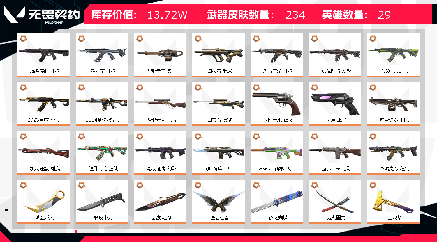 【卡面信息】西部未来卡面,先驱者卡面,情人节不死鸟卡面,分崩离析卡面,我眼中的世界卡面,双城之战拥抱卡面,捣蛋鬼出卡面,超能偶像卡面,虹吸式咖啡壶卡面,逆向独行卡面,Luie卡面,势不可挡芮娜卡面,双城之战谜团卡面,24冠军混沌黯夜怪谈艾沃莉源能者电玩显卡套塑水宗归零者盖世套光明哨兵机动狂飙全息波普破败军械掠夺掠影无畏奇点2.0白银青铜黄金黑铁砖石铂金神话盖亚洪荒离火刃毁灭骑士VCT爪刀创纪元镭切虚空遗器离子2.0西部未来蝴蝶刀黑波显卡AK无畏光荣异象RGX 11Z PRO奇点正义23盖亚铂金22冠军苍龙之刃21冠军超时空卫士掠影2.0影钩赋能掠夺爪显卡AK滋滋X特工队25冠军混沌2.0末日泡泡多弥尔的复仇;西部未来 奥丁,紫金爪刀,剥皮小刀,威龙之刃,归零者 獠犬,盖亚的复仇 狂徒,掠影 戍卫,