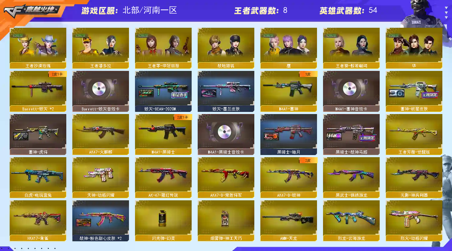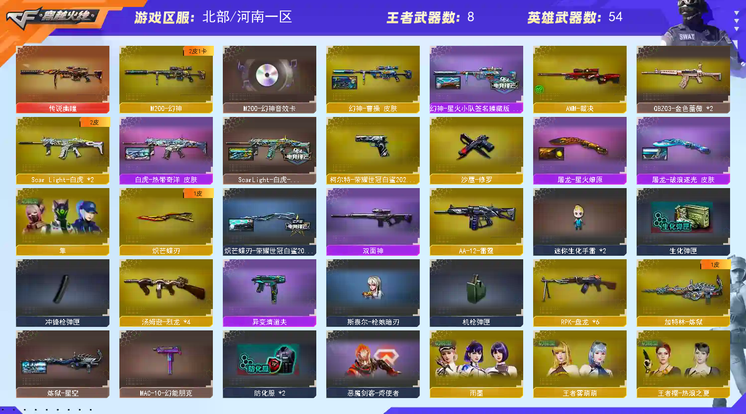 白鲨柯尔特 白鲨炽芒蝶刃 6个四防角色,生化标配隼5烈斯泰尔枪娘6盘炼狱蝴蝶刀2妖姬雷 鹰/隼/雨墨/华/蛇隐宗/蛇姬/王者潘多拉/王者雾萌萌/灵动武士 传说幽瞳 M200-幻神/Barrett-毁灭(2)/AWM-天龙/AWM-裁决/M4A1-雷神/M4A1-黑骑士/王者风势-觉醒版/HK417-朱雀/Scar Light-白虎(2)/白虎-电玩蓝兔/AK47-火麒麟/QBZO3-金色蔷薇(2)/烈火-动感闪耀/RPK-盘龙(6)/汤姆逊-烈龙//加特林-炼狱/麒麟刺/龙啸/擎天/屠龙(2)/王者之锋-觉醒版/炽芒蝶刃/王者芳薇-觉醒版/王者火魄-觉醒版 幻神:星火小队/曹操 毁灭:虹光风暴 /BEAN/墨兰 雷神:航星/雷神 黑骑士:马超/暗月 白虎:冠军之虎/热带奇洋/ 炼狱:星空 屠龙:破浪逐光/星火燎原 朱雀音效卡/幻神音效卡/黑骑士音效卡/雷神音效卡/毁灭音效卡 注意:此号已进行虚拟财产备案,如遇封号,我们会将恶意租客的注册手机号,姓名,信息和游戏IP地址提交给公安局进行立案,按照原价赔偿,请勿以身试法! 请老板们文明游戏谢谢您的配合!;柯尔特-荣耀世冠白鲨2023,炽芒蝶刃,隼,王者沙漠玫瑰,RPK-盘龙,QBZ03-金色蔷薇,传说幽瞳,