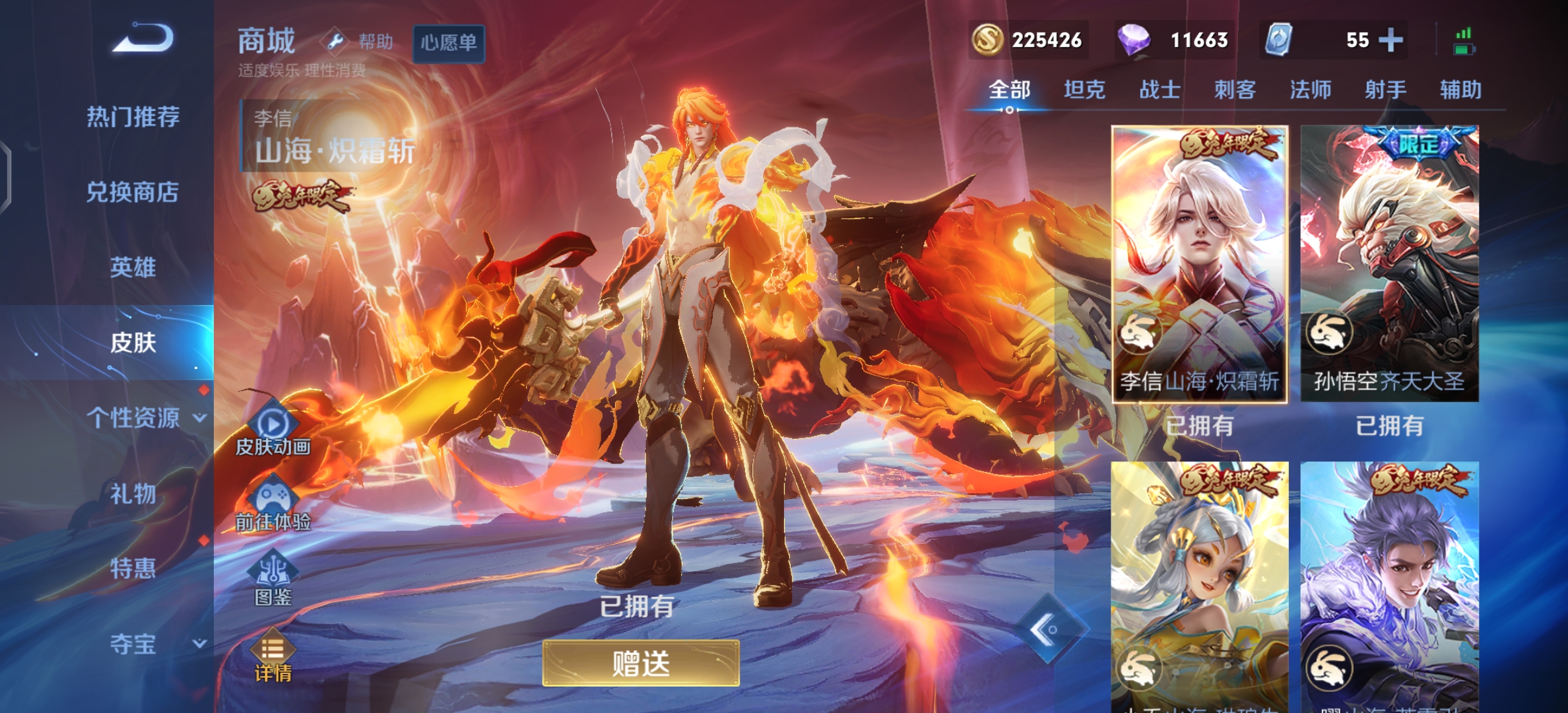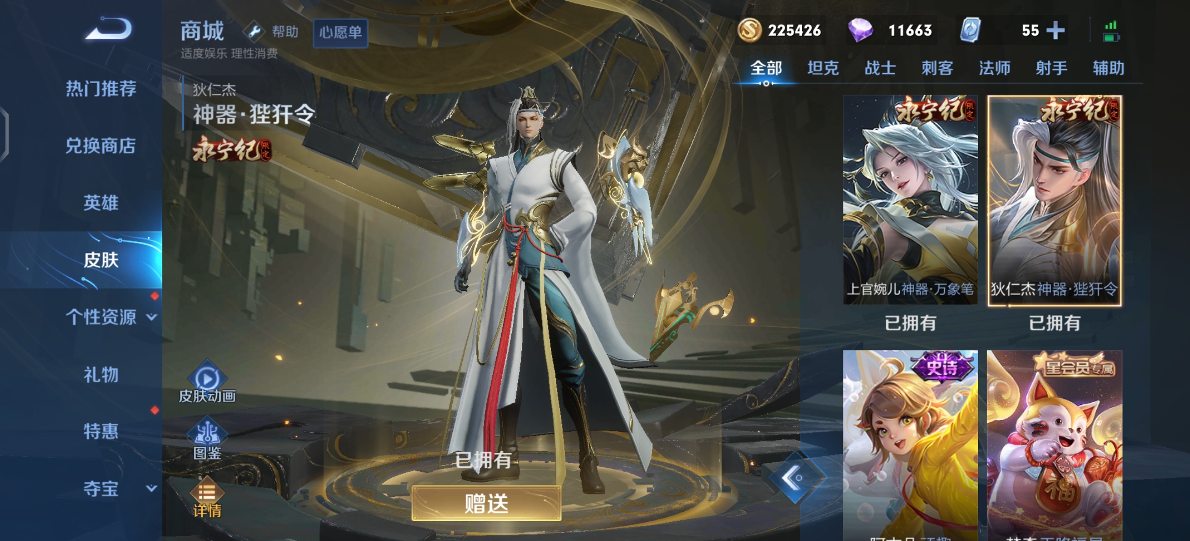 v10、537皮6水4无双、安琪拉-颠倒童话·魔镜、朵莉亚-神骥、遇见神鼓、齐天大圣、白虎志、韩信荣耀典藏、73传说、时之魔女、瑶无双、青丘、九尾、神器明辉仪