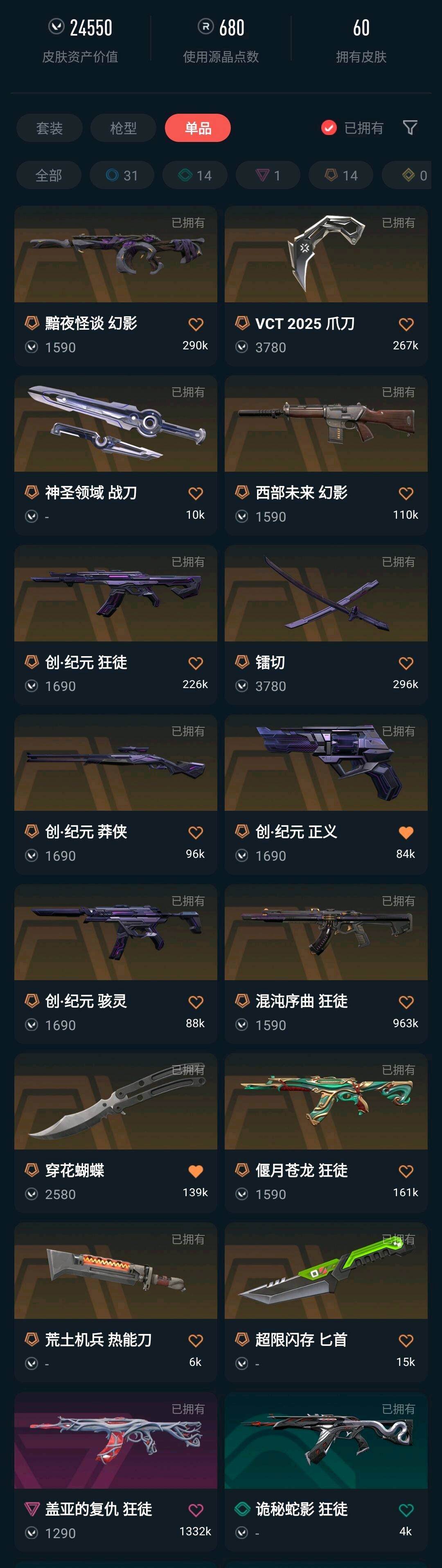 2.4W库存✨VCT2025爪刀✨穿花蝴蝶✨创纪元套装✨混沌 盖亚双幻神狂徒✨西部 古神 幻影