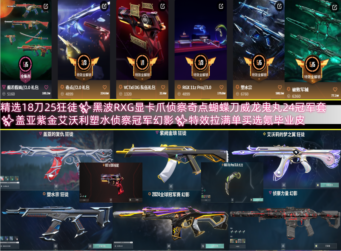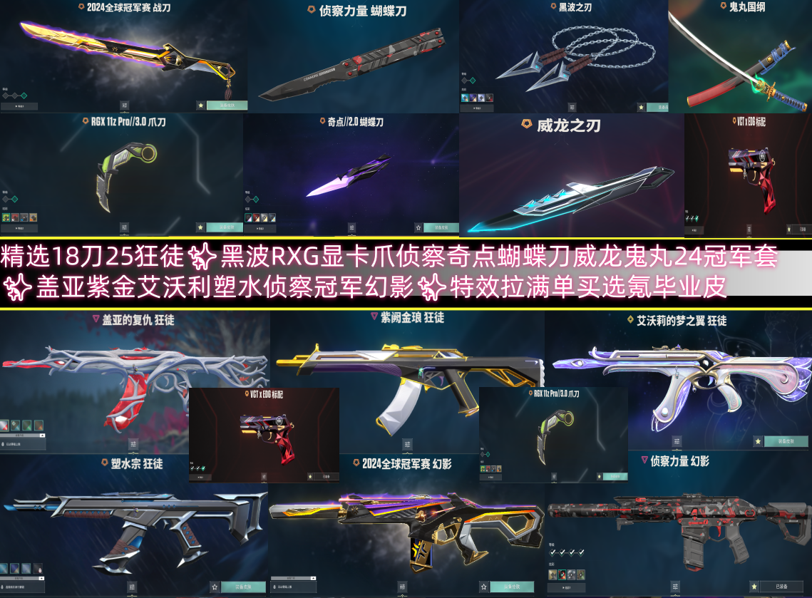 精选18刀25狂徒✨黑波RXG显卡爪侦察奇点蝴蝶刀威龙鬼丸24冠军套✨盖亚紫金艾沃利塑水侦察冠军幻影✨特效拉满单买选氪毕业皮;黑波之刃,威龙之刃,上古龙炎 判官,盖亚的复仇 狂徒,掠影 狂徒,侦察力量 幻影,紫阙金琅 狂徒,