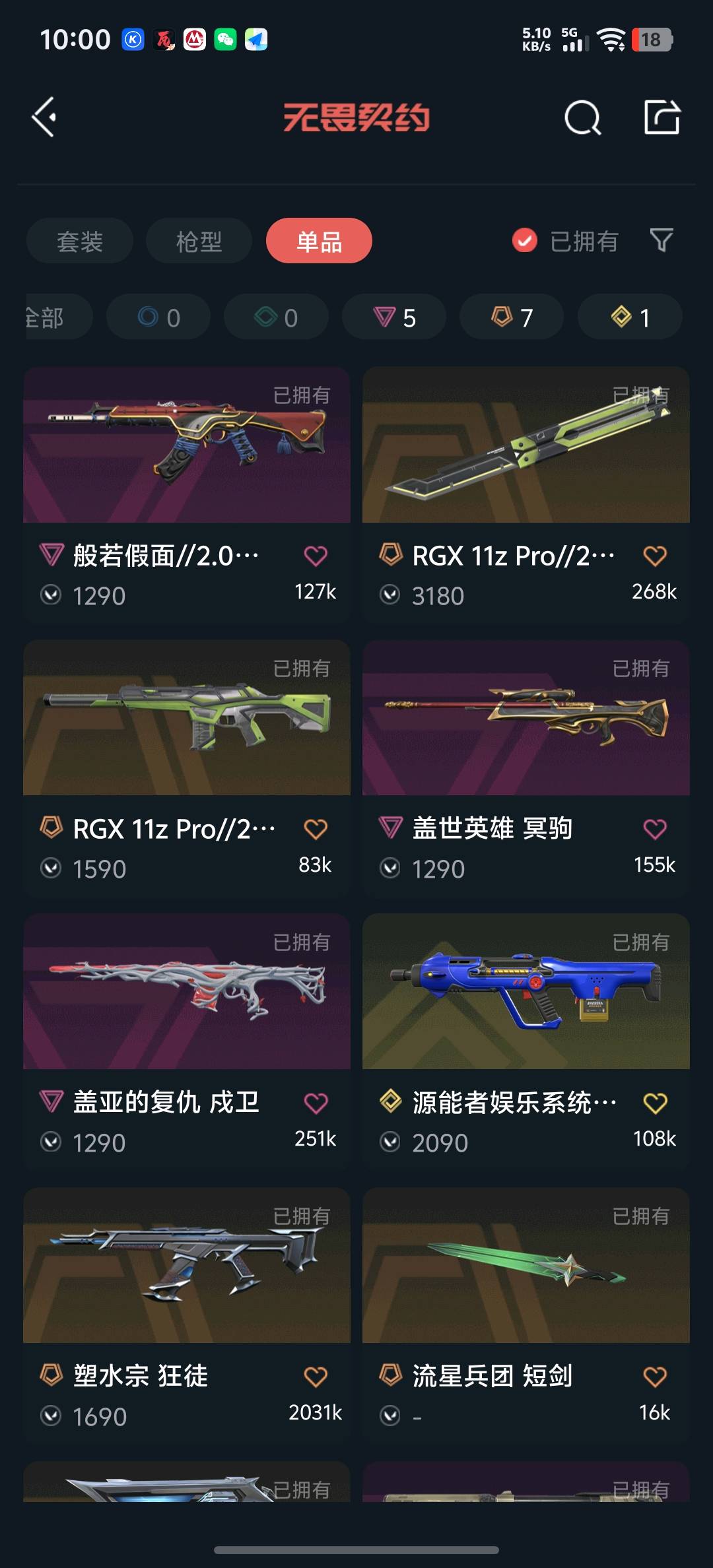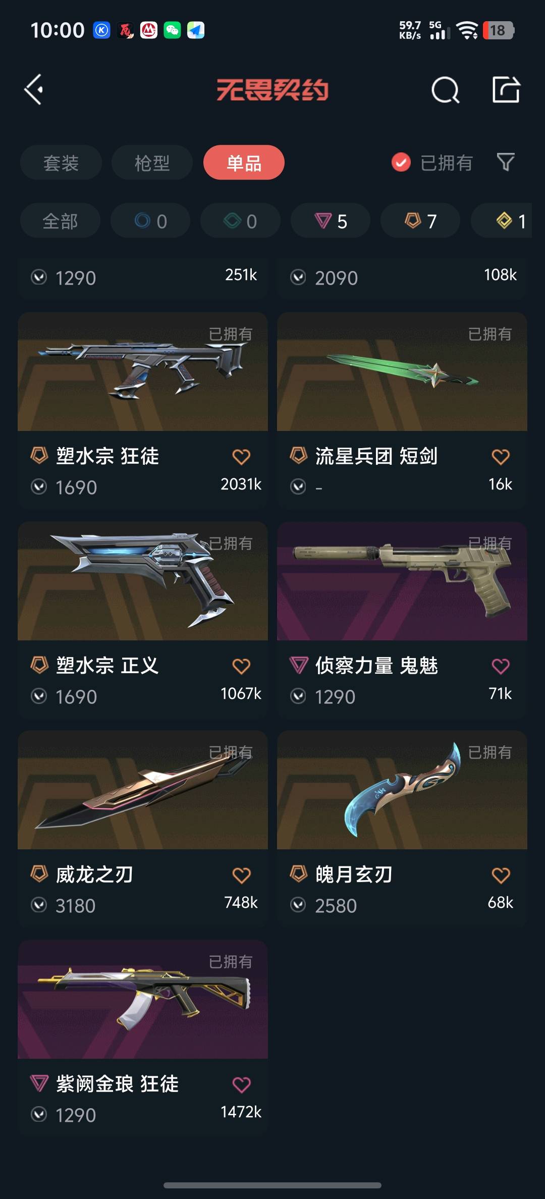武器皮肤31英雄28卓越4终极1传奇6;威龙之刃,紫阙金琅 狂徒,塑水宗 狂徒,塑水宗 正义,