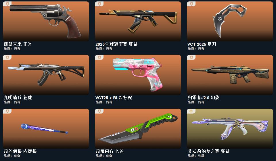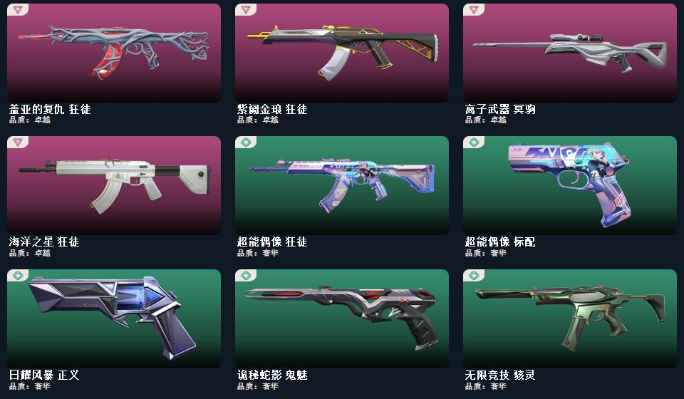 VCT爪刀,盖亚,紫金,25冠军 猫猫,光明哨兵,海洋之星狂徒归零者m4,离子大狙,西部正义,黄金三隐藏分低。