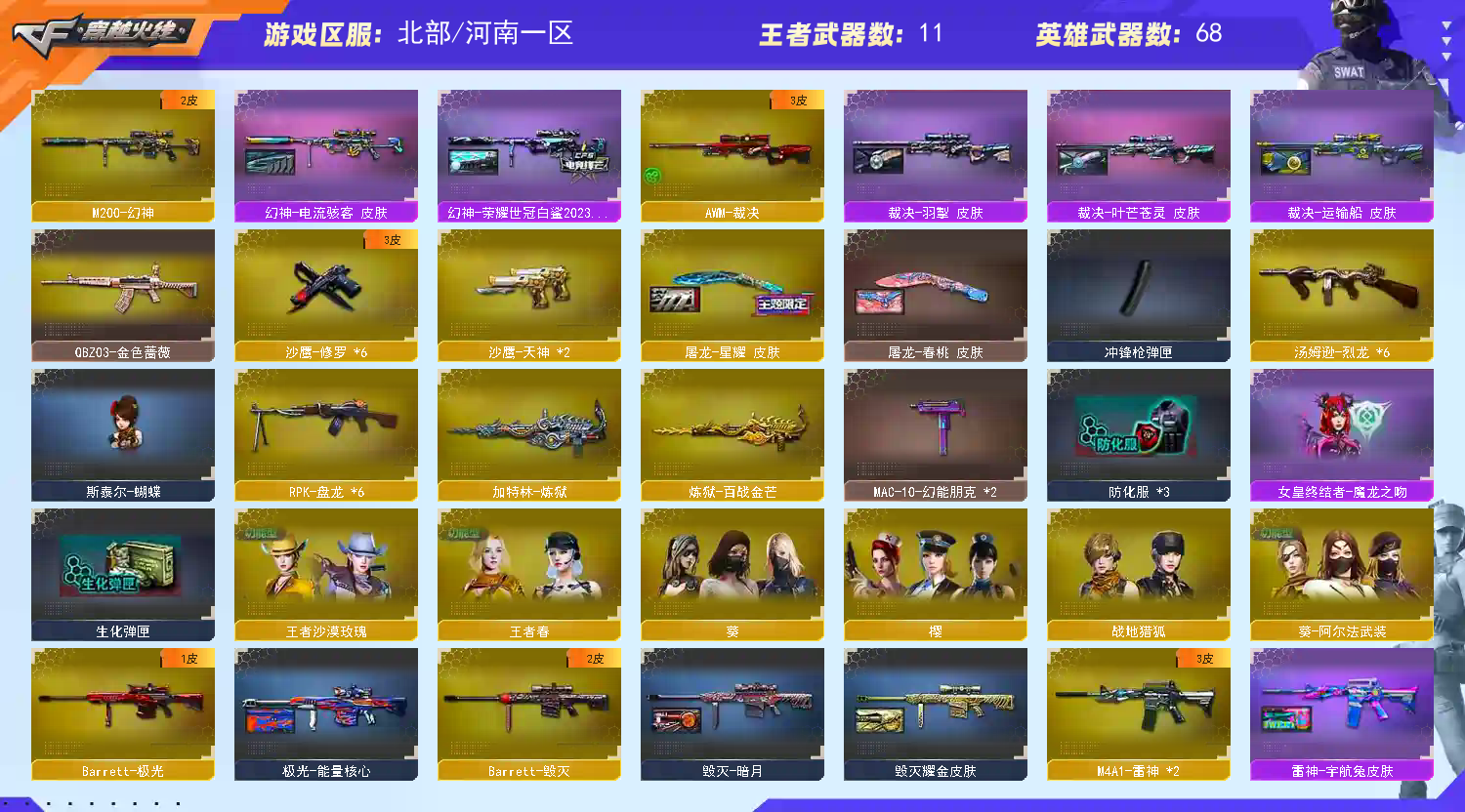 77v-幻神-幻神白鲨2023-幻神电流骇客-qbz金色蔷薇-毁灭-极光-裁决-6盘龙-炼狱-6烈龙-火麒麟-黑龙-雷神-黑骑士-修罗-天神-屠龙-龙啸-擎天-麒麟刺-荣耀世冠龙啸-蛇隐宗-王者春-王者沙漠玫瑰-黑骑士音效卡-火麒麟音效卡-屠龙星耀-裁决叶芒苍灵-裁决运输船-裁决羽擎-冠军之心 请看截图 喜欢请点收藏 方便下次租 可以当成自己号玩【感谢老板租此号】优质账号 如果有个别装备到期 影响不大的情况下请不要维权,如遇到账号密码错误 顶号 冻结 请直接维权即可, 科技大佬麻烦看了请绕道,出zu不易,给你跪下了!;