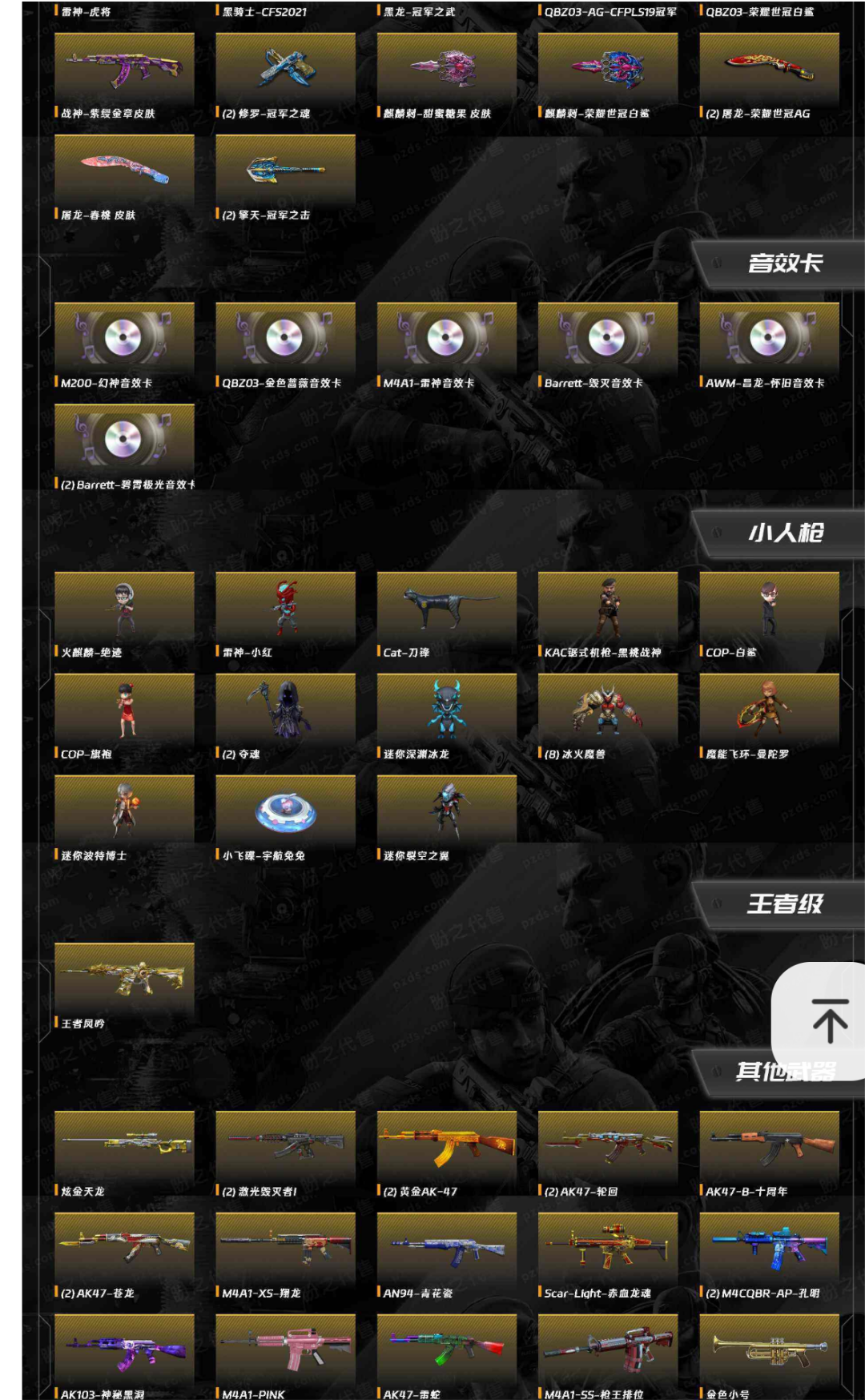传说艾丽莎/传说夜影/幻神世冠白鲨/幻神周瑜加音效卡。雷神qbz,毁灭,黑龙,王者之魄,天罚等皮肤+