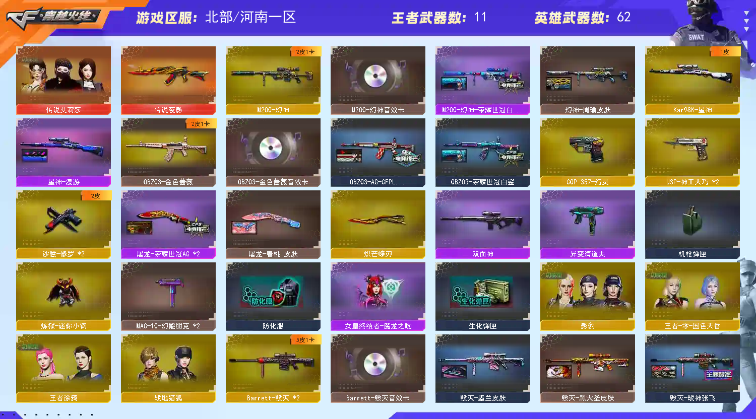 首页 > 租号大厅 > 穿越火线 > 网通区/河南一区 > 传说艾丽莎/传说夜影/幻神世冠白鲨/幻神周瑜加音效卡。雷神qbz,毁灭,黑龙,王者之魄,天罚等皮肤+