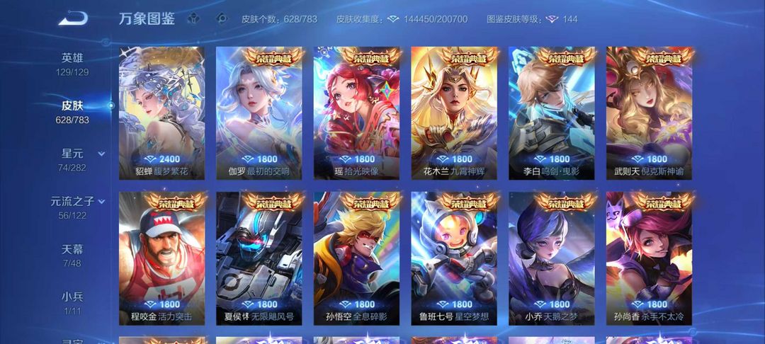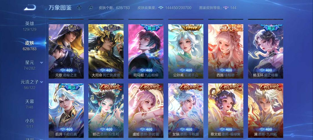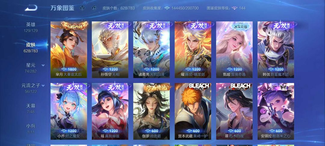 v10、537皮6水4无双、安琪拉-颠倒童话·魔镜、朵莉亚-神骥、遇见神鼓、齐天大圣、白虎志、韩信荣耀典藏、73传说、时之魔女、瑶无双、青丘、九尾、神器明辉仪