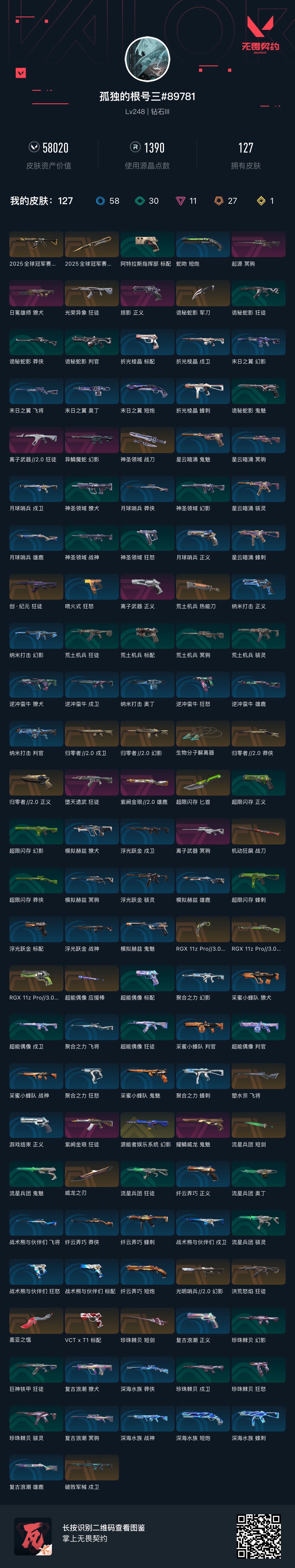 武器皮肤数量 127 英雄数量 28;威龙之刃,洪荒怒焰 狂徒,异鳞魔蛇 幻影,源能者娱乐系统 幻影,紫阙金琅 狂徒,堕天遗武 狂徒,光荣异象 狂徒,