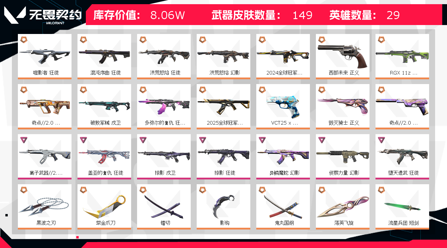 首页 > 租号大厅 > 无畏契约-wegame > wegame/wegame > 精氪毕业皮齐全特效炫彩拉满⚡显卡爪影勾落英蝴蝶刀黑波⚡25冠军多弥尔混沌盖亚流脓狂徒24冠军侦查幻影