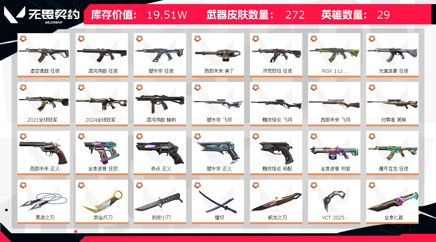 20W✨26VCT怜悯✨21+24冠军+颗秒套神话挂饰✨40近战紫金黑波剥皮✨31狂徒显卡流脓混沌