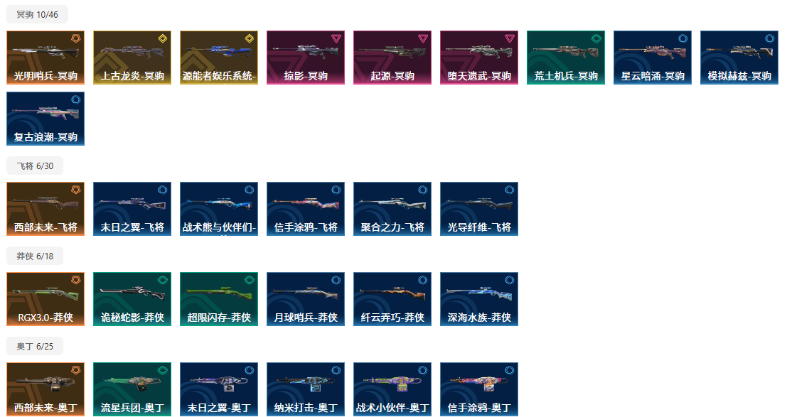 【拥有狙击枪】堕天遗武-冥驹,起源-冥驹,诡秘蛇影-莽侠,荒土机兵-冥驹,超限闪存-莽侠,末日之翼-飞将,星云暗涌-冥驹,月球哨兵-莽侠,模拟赫兹-冥驹,聚合之力-飞将,战术熊与伙伴们-飞将,纤云弄巧-莽侠,深海水族-莽侠,复古浪潮-冥驹,光导纤维-飞将,信手涂鸦-飞将,