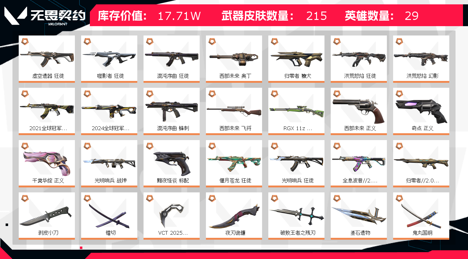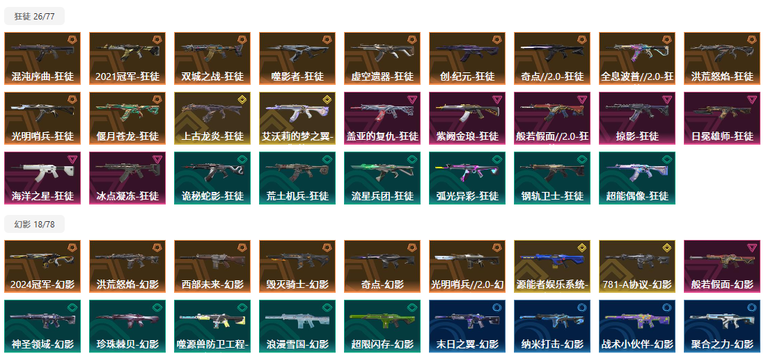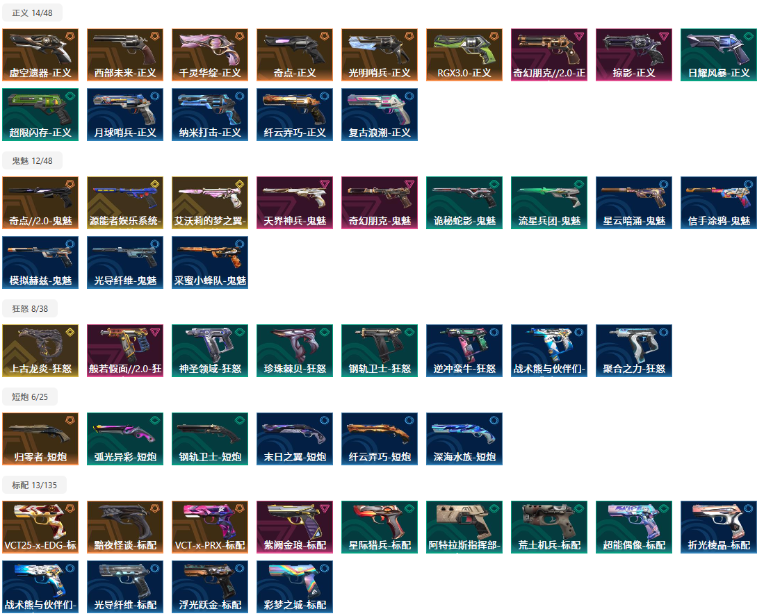 【拥有手枪】VCT25-x-EDG-标配,VCT-x-PRX-标配,虚空遗器-正义,千灵华绽-正义,黯夜怪谈-标配,归零者-短炮,奇点-正义,艾沃莉的梦之翼-鬼魅,天界神兵-鬼魅,紫阙金琅-标配,奇幻朋克-鬼魅,奇幻朋克//2.0-正义,星际猎兵-标配,阿特拉斯指挥部-标配,日耀风暴-正义,诡秘蛇影-鬼魅,神圣领域-狂怒,荒土机兵-标配,超限闪存-正义,超能偶像-标配,流星兵团-鬼魅,珍珠棘贝-狂怒,钢轨卫士-短炮,钢轨卫士-狂怒,弧光异彩-短炮,末日之翼-短炮,折光棱晶-标配,星云暗涌-鬼魅,月球哨兵-正义,纳米-正义,逆冲蛮牛-狂怒,浮光跃金-标配,模拟赫兹-鬼魅,聚合之力-狂怒,采蜜小蜂队-鬼魅,纤云弄巧-正义,战术熊与伙伴们-狂怒,纤云弄巧-短炮,战术熊与伙伴们-标配,复古浪潮-正义,深海水族-短炮,光导纤维-鬼魅,光导纤维-标配,彩梦之城-标配,信手涂鸦-鬼魅,