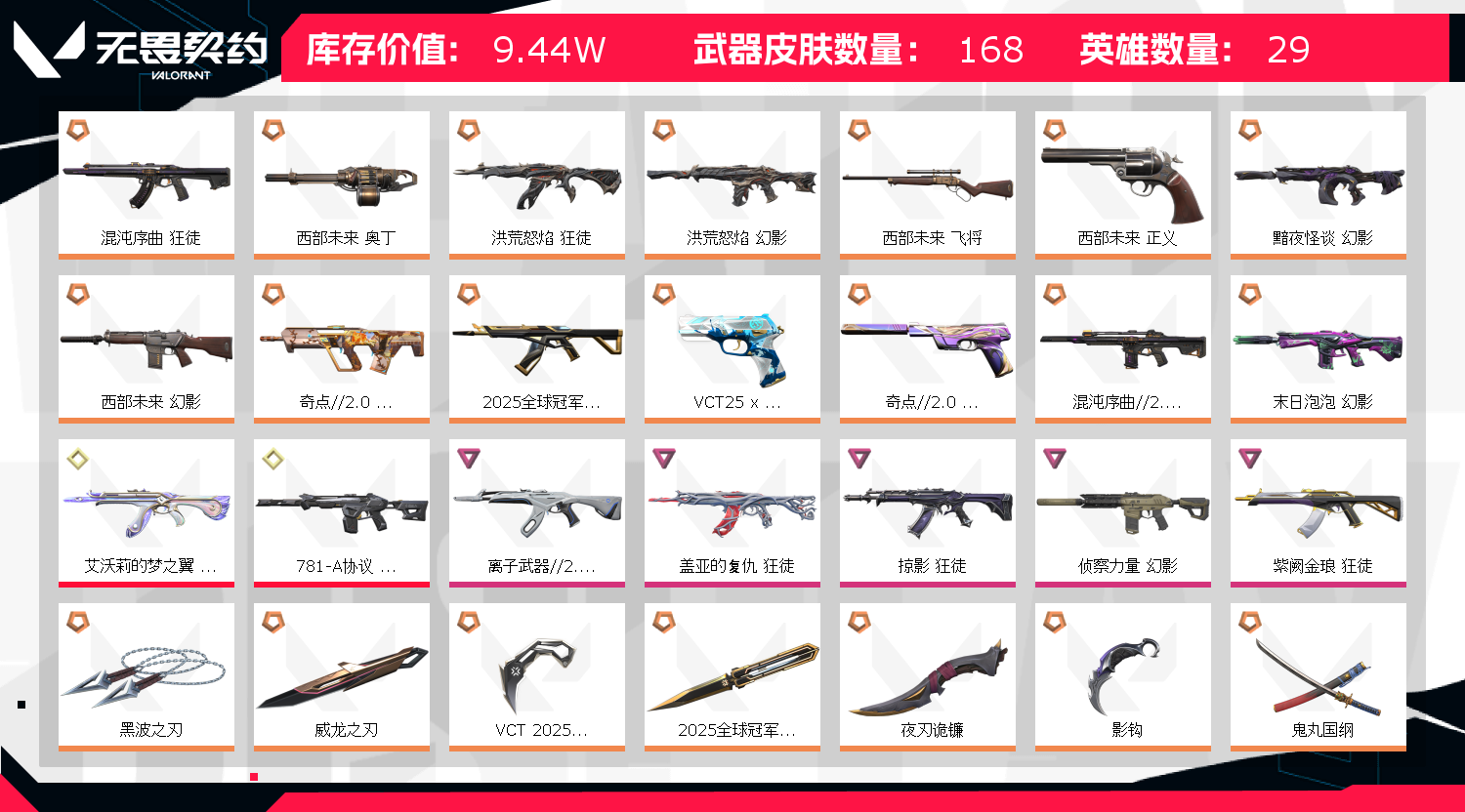 10W库存+2000R点❤25/22/24冠军套25爪掠夺2.0套❤18狂徒❤20刀❤10幻影;西部未来 奥丁,黑波之刃,威龙之刃,VCT 2025 爪刀,盖亚的复仇 狂徒,洪荒怒焰 狂徒,掠影 狂徒,