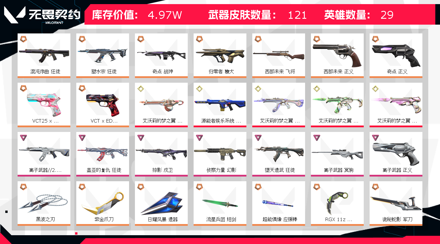 可排位119皮5w库存;艾沃莉的梦之翼 奥丁,奇点 战神,黑波之刃,紫金爪刀,归零者 獠犬,盖亚的复仇 狂徒,掠影 戍卫,