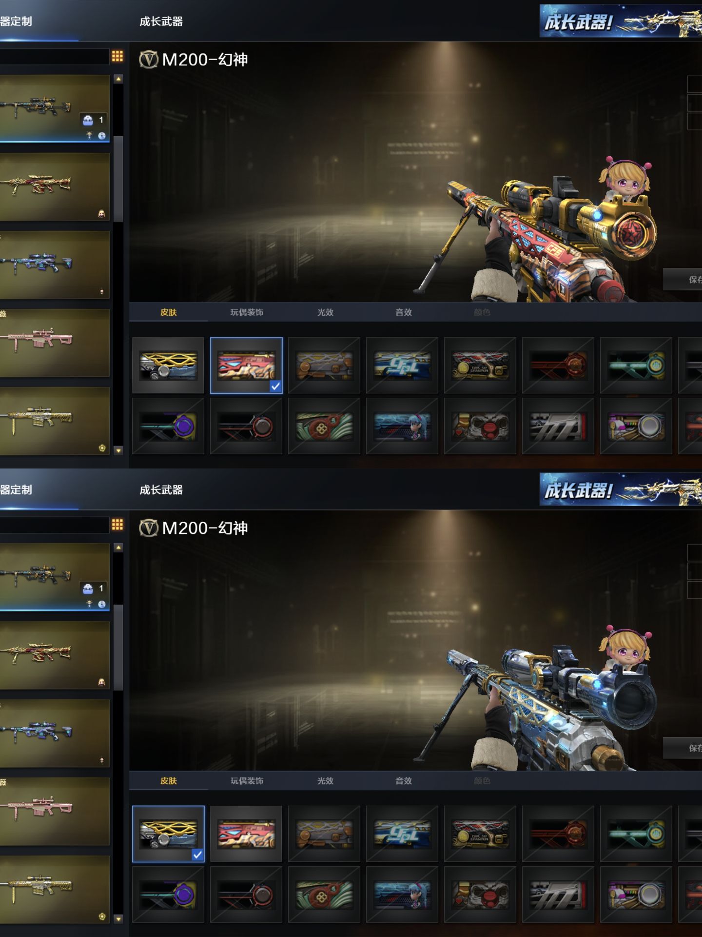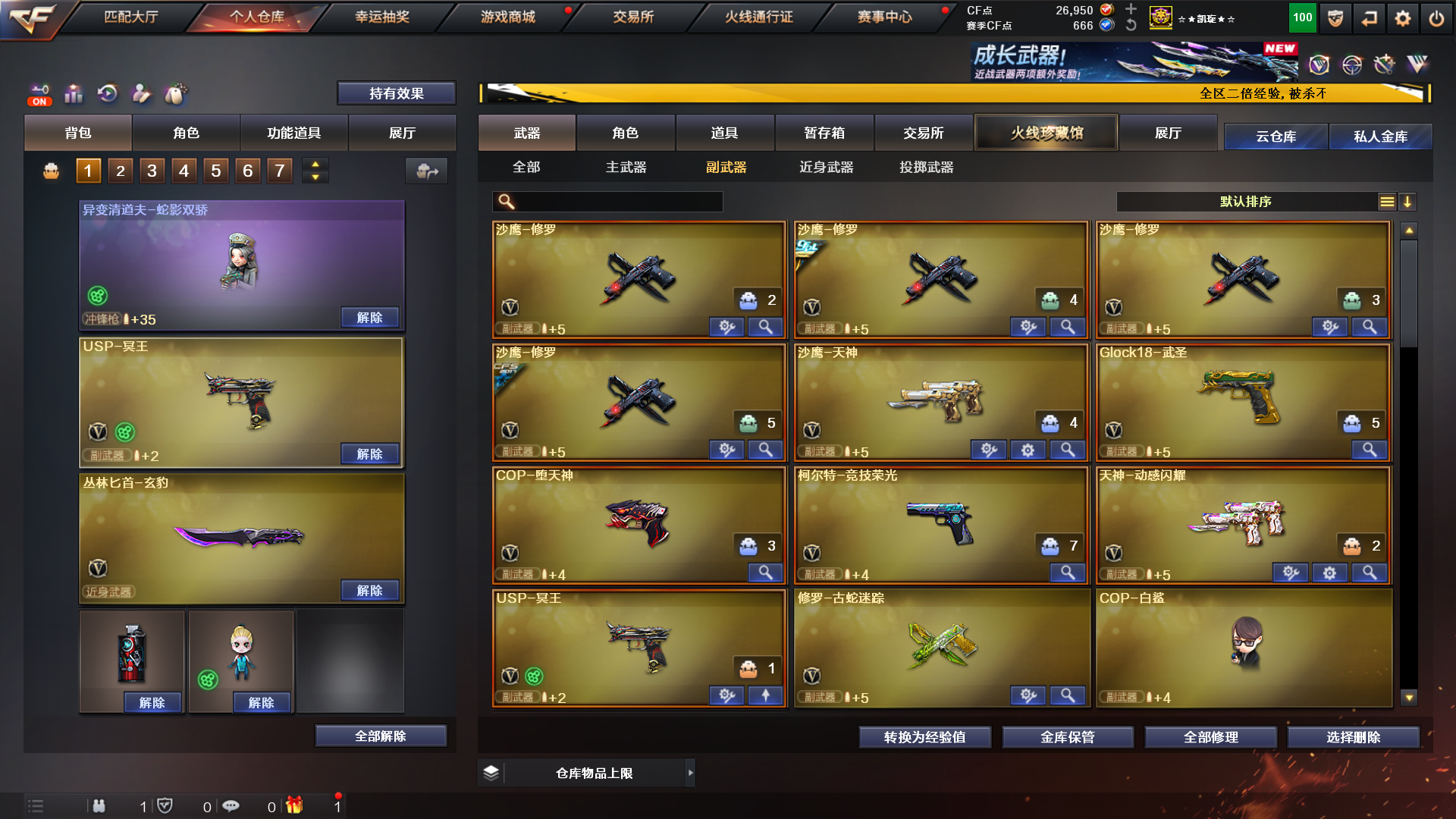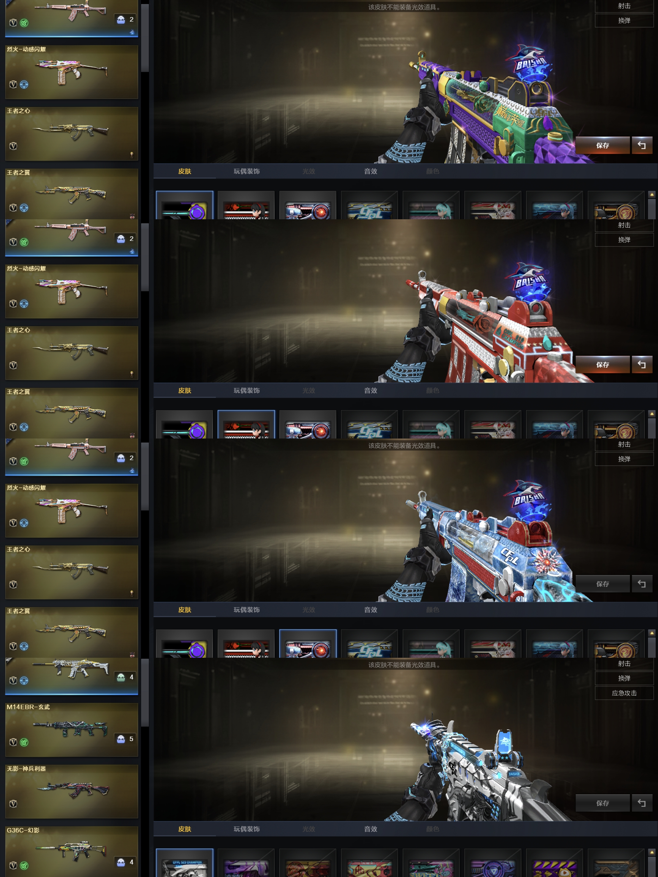 传说圣谕/影刹/星骇/荆棘/冠军幻/星神三皮/冠军之刃×2/六烈清道夫小人枪×2/裁决三件套冥王;Knife-冠军之刃,传说影煞,传说星骇,QBZ03-金色蔷薇,G36C-幻影,M200-幻神,Scar Light-白虎,