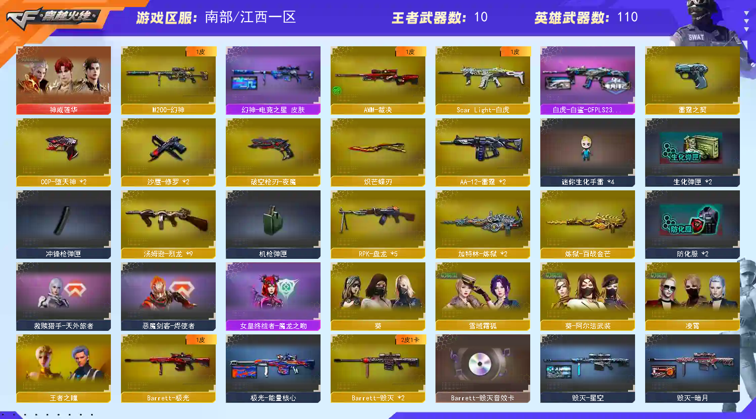 爆破生化号神威莲华 白虎加白鲨CFPL2023皮肤五盘九烈两炼狱 斯泰尔幻面灵狐小人枪 夜魔套装 雷神黑骑士毁灭音效卡 破空枪刃雷霆堕天神cop 雷霆夜魔投掷套 夜魔雷霆投掷套装 凌霄 葵 朱雀天龙裁决幻神黑龙雷神无影黑鲨雷霆aa12 龙血毁灭火麒麟烈火 修罗天神 王者之魄 武 幻 势 力 怒 击 炫金毁灭天龙 透明烟雾头护目镜幻神电竞之心皮肤 本人是女玩家平时玩的不多请爱惜吖~谢谢老板 可排位 可巅峰赛 排位赛开了话请老板尽量打完不然会禁赛啊 进游戏点仓库如果是怀旧装备那是进错仓库了点到cfs爆破模式去了在仔细看看就行了谢谢老板理解;炽芒蝶刃,RPK-盘龙,M200-幻神,Scar Light-白虎,