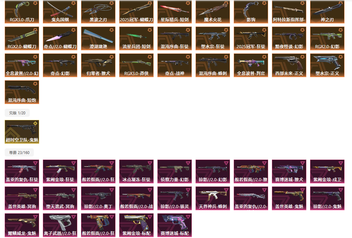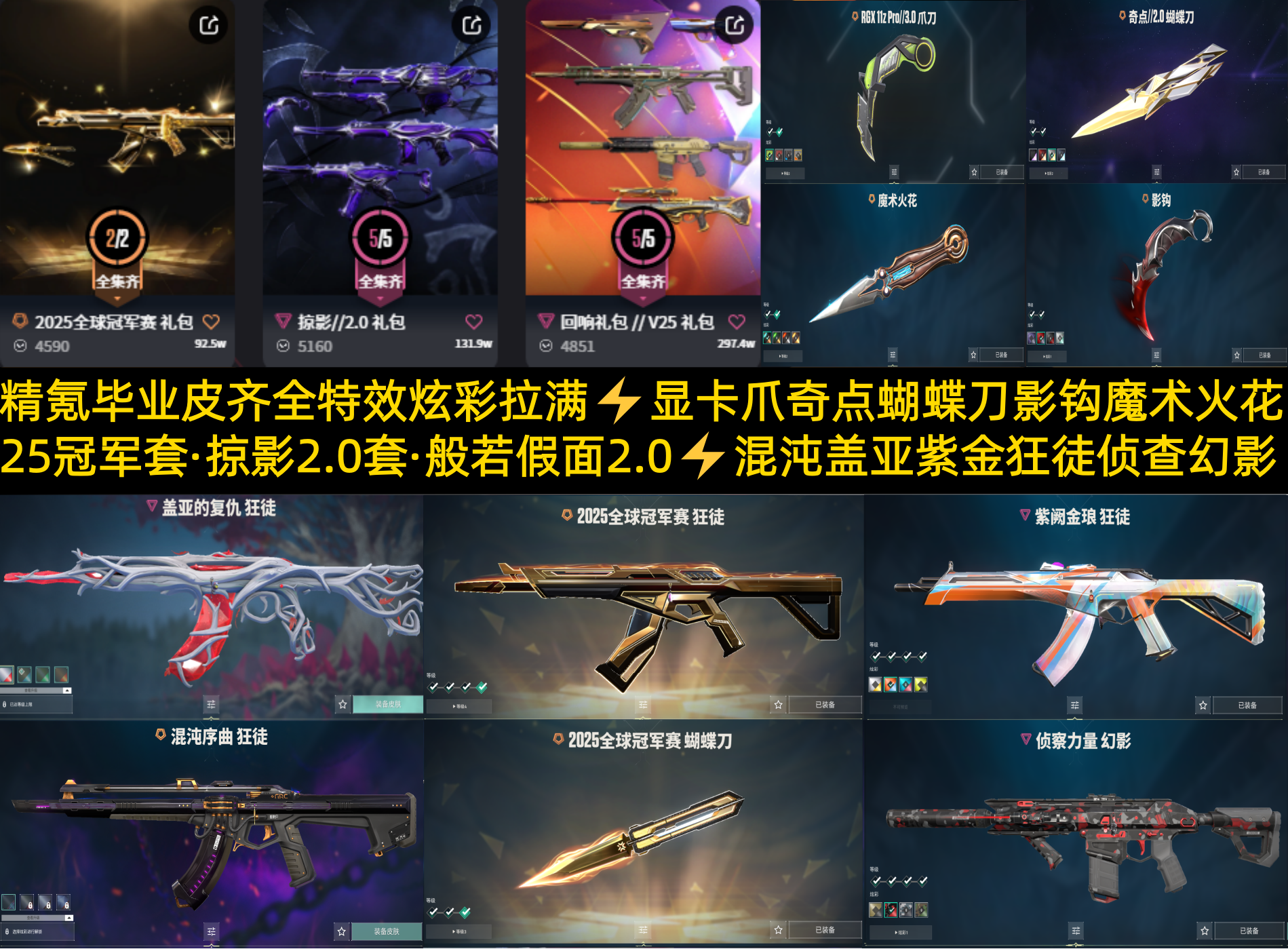 精氪齐全特效炫彩拉满⚡25冠军掠影2.0假面2套装⚡显卡爪魔术火花影钩黑波蝴蝶刀⚡混沌盖亚紫金狂徒