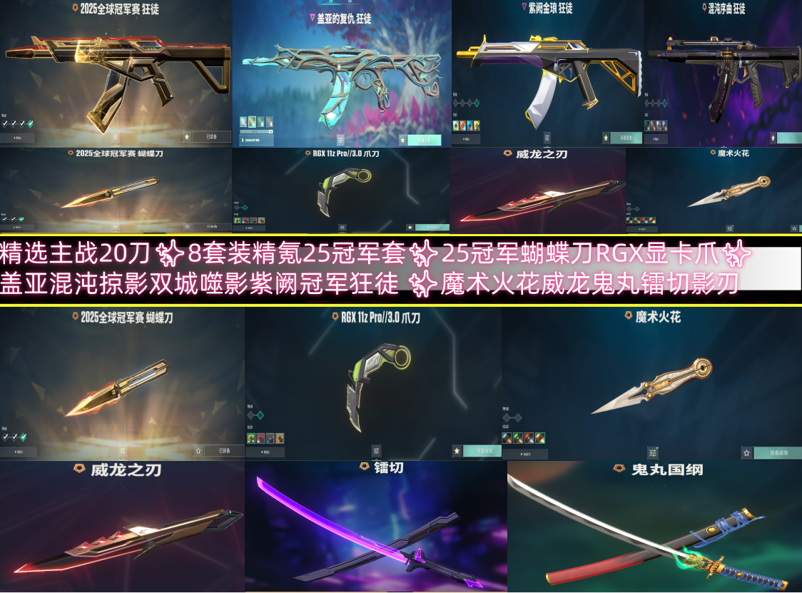 精选主战20刀✨8套装精氪25冠军套✨25冠军蝴蝶刀RGX显卡爪✨ 盖亚混沌掠影双城噬影紫阙冠军狂徒 ✨魔术火花威龙鬼丸镭切影刃;