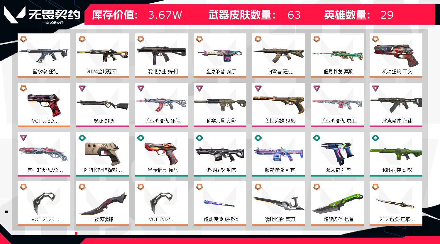 首页 > 租号大厅 > 无畏契约-wegame > wegame/wegame > 别挂机感谢,24冠军套装,VCT爪刀,夜刃诡镰,EDG标配,盖亚、塑水、归零、冰点狂徒。侦查幻影