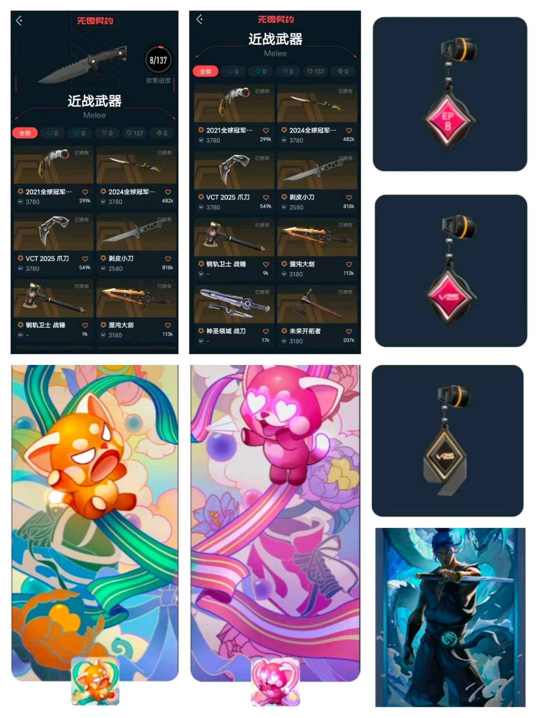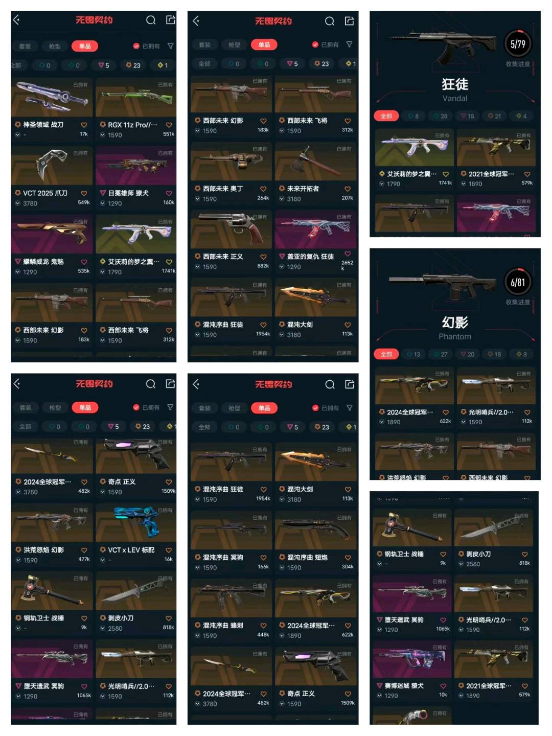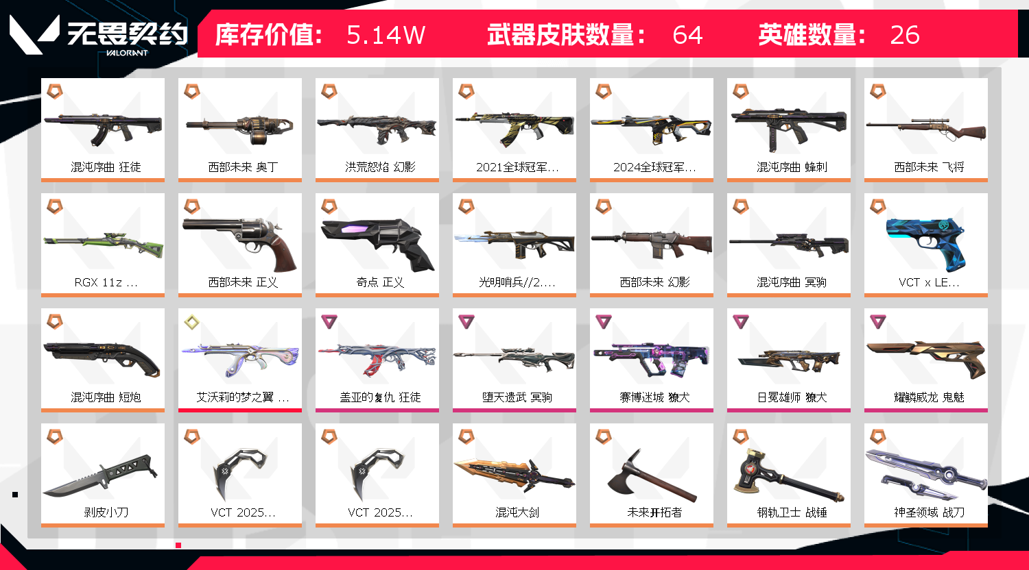 你好;西部未来 奥丁,剥皮小刀,VCT 2025 爪刀,盖亚的复仇 狂徒,洪荒怒焰 幻影,混沌序曲 狂徒,2021全球冠军赛 狂徒,
