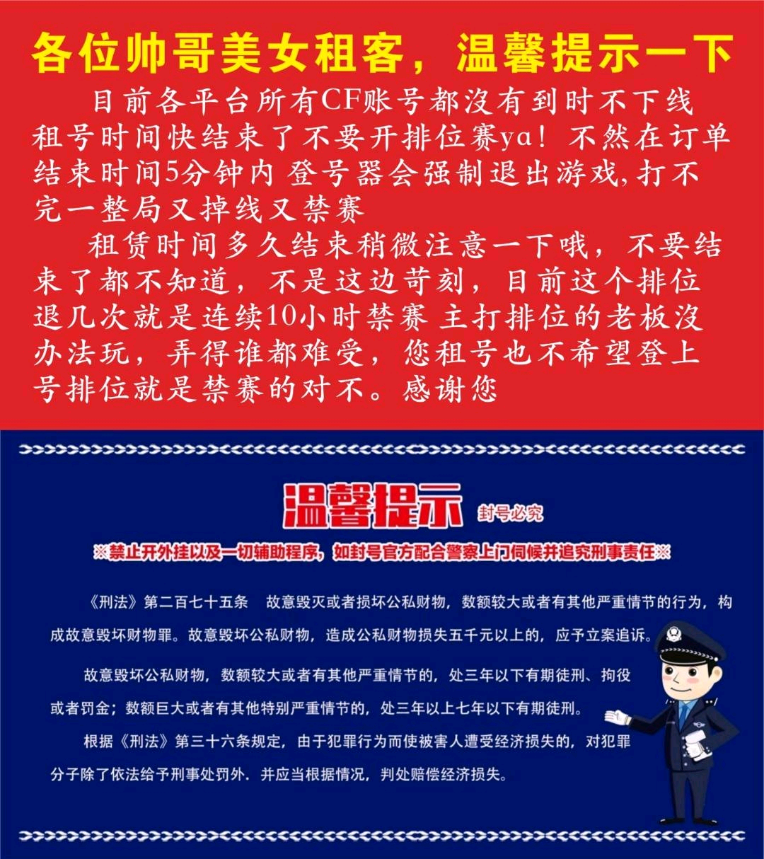 帐号介绍 注意:此号已备案(百度可查)已在福建公安局进行虚拟财产备案,如遇封号, 我们会将恶意租客的*手机号和登录游戏ip地址提交给公安局进行立案,法院传票,请勿以身试法◆◆◆◆◆◆◆◆◆◆◆细节看图【账号问题请如实写,后台会处理】 !!!!!!!!!!!!!!!!!!!!!!!!!!!!!!!!!!!!!!!!!!!!!!!!!!! 【打排位不要中途退出会禁排位,发现永久拉黑(租号过程中禁赛的),时间不足禁止开排位,会导致禁赛】 !!!!!!!!!!!!!!!!!!!!!!!! 【调烟雾头 很容易被封1天(关小黑屋),禁止调】;USP-雷暴,炽芒蝶刃,Knife-冠军之刃,隼,电竞教官-云悠悠,晴雅,QBZ03-金色蔷薇,