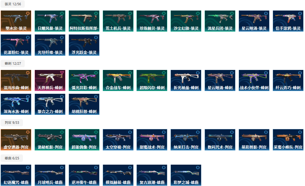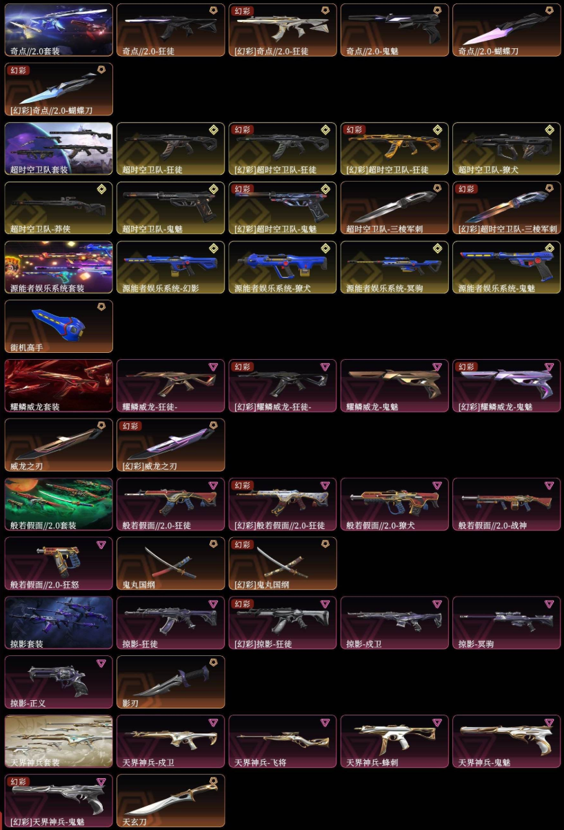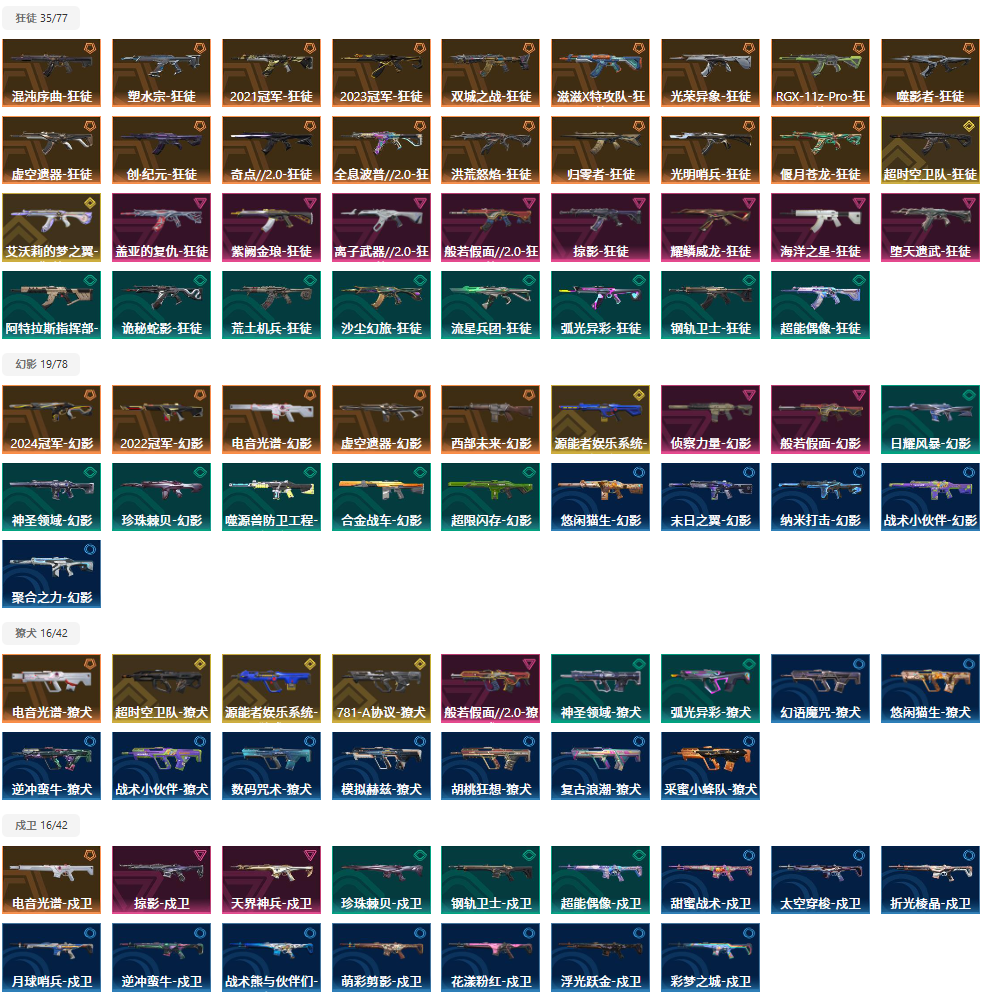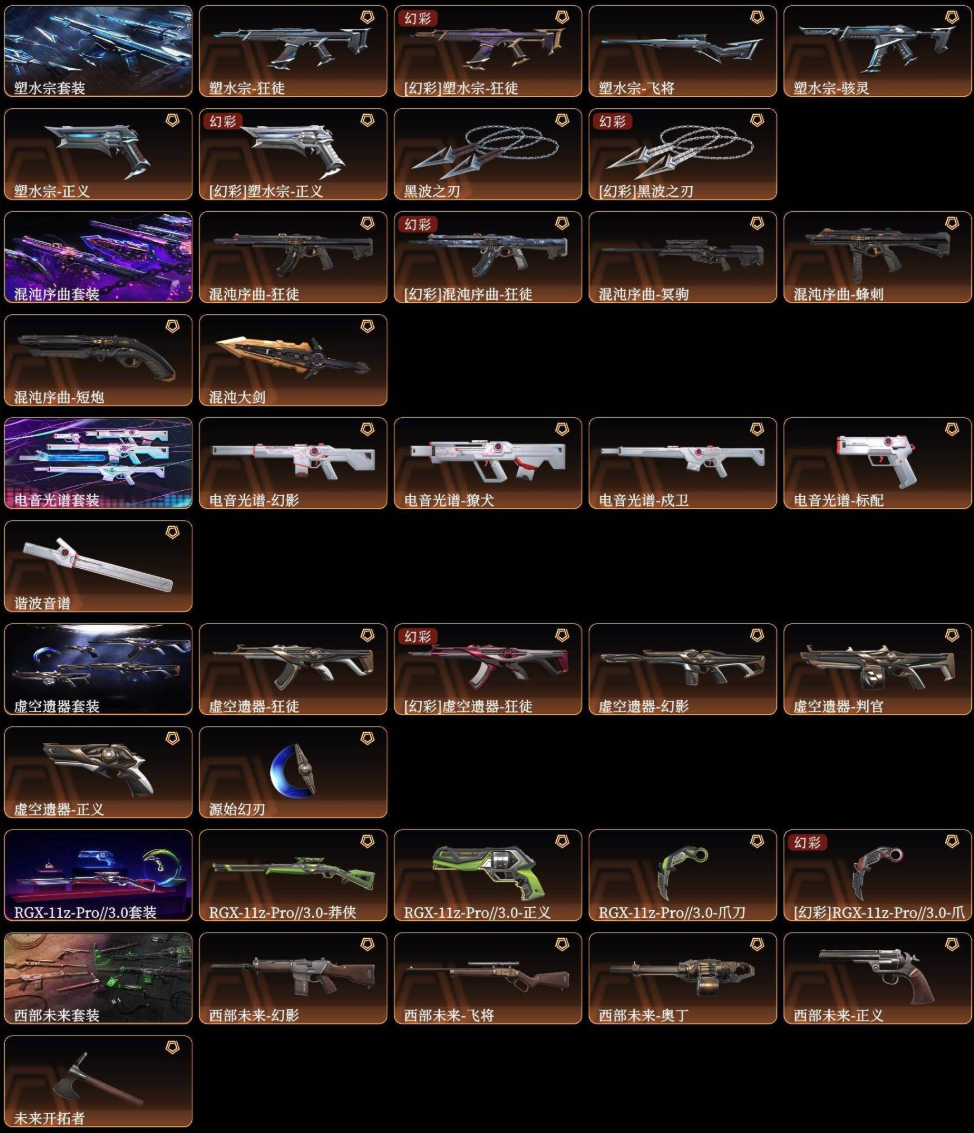 【拥有手枪】VCT-x-WOL-标配,VCT-x-PRX-标配,双城之战-正义,奇点-正义,盖亚的复仇-鬼魅,离子武器-正义,阿特拉斯指挥部-标配,日耀风暴-正义,诡秘蛇影-鬼魅,神圣领域-狂怒,荒土机兵-标配,超限闪存-正义,超能偶像-标配,流星兵团-鬼魅,珍珠棘贝-狂怒,钢轨卫士-狂怒,钢轨卫士-短炮,沙尘幻旅-正义,弧光异彩-短炮,合金战车-正义,太空穿梭-正义,悠闲猫生-短炮,甜蜜战术-鬼魅,幻语魔咒-狂怒,折光棱晶-标配,末日之翼-短炮,星云暗涌-鬼魅,月球哨兵-正义,纳米-正义,逆冲蛮牛-狂怒,模拟赫兹-鬼魅,浮光跃金-标配,聚合之力-狂怒,采蜜小蜂队-鬼魅,纤云弄巧-正义,战术熊与伙伴们-狂怒,纤云弄巧-短炮,战术熊与伙伴们-标配,复古浪潮-正义,深海水族-短炮,光导纤维-鬼魅,光导纤维-标配,萌彩剪影-狂怒,胡桃狂想-鬼魅,信手涂鸦-鬼魅,彩梦之城-标配,数码咒术-鬼魅,花漾粉红-狂怒,超能冲撞-标配,