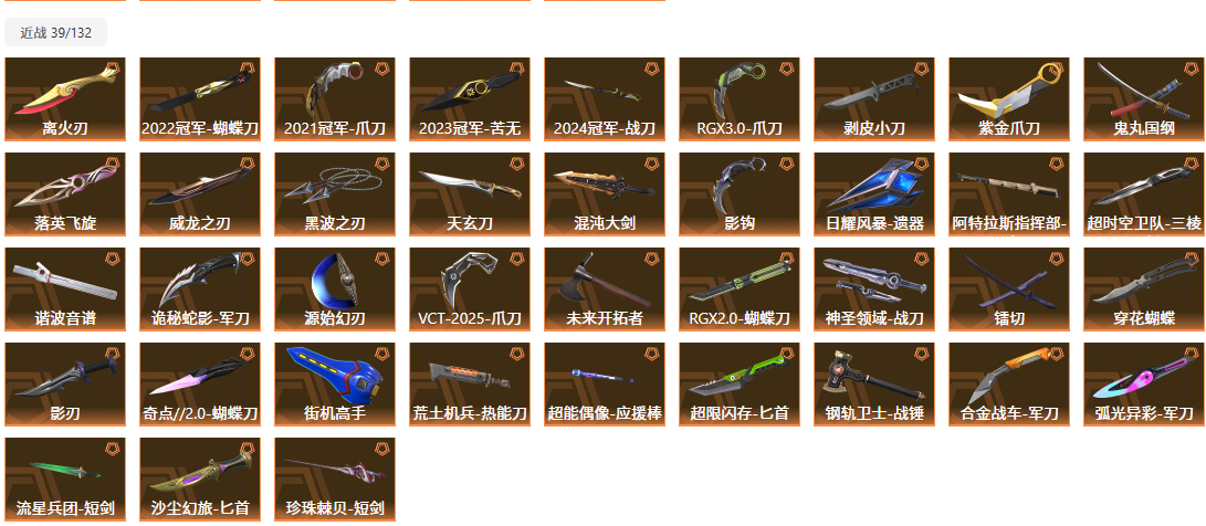 【拥有近战武器】阿特拉斯指挥部-甩棍,日耀风暴-遗器,诡秘蛇影-军刀,神圣领域-战刀,VCT-2025-爪刀,荒土机兵-热能刀,超限闪存-匕首,超能偶像-应援棒,流星兵团-短剑,珍珠棘贝-短剑,钢轨卫士-战锤,沙尘幻旅-匕首,弧光异彩-军刀,合金战车-军刀,离火刃,影钩,RGX-11z-Pro//2.0-蝴蝶刀,镭切,落英飞旋,紫金爪刀,剥皮小刀,穿花蝴蝶,