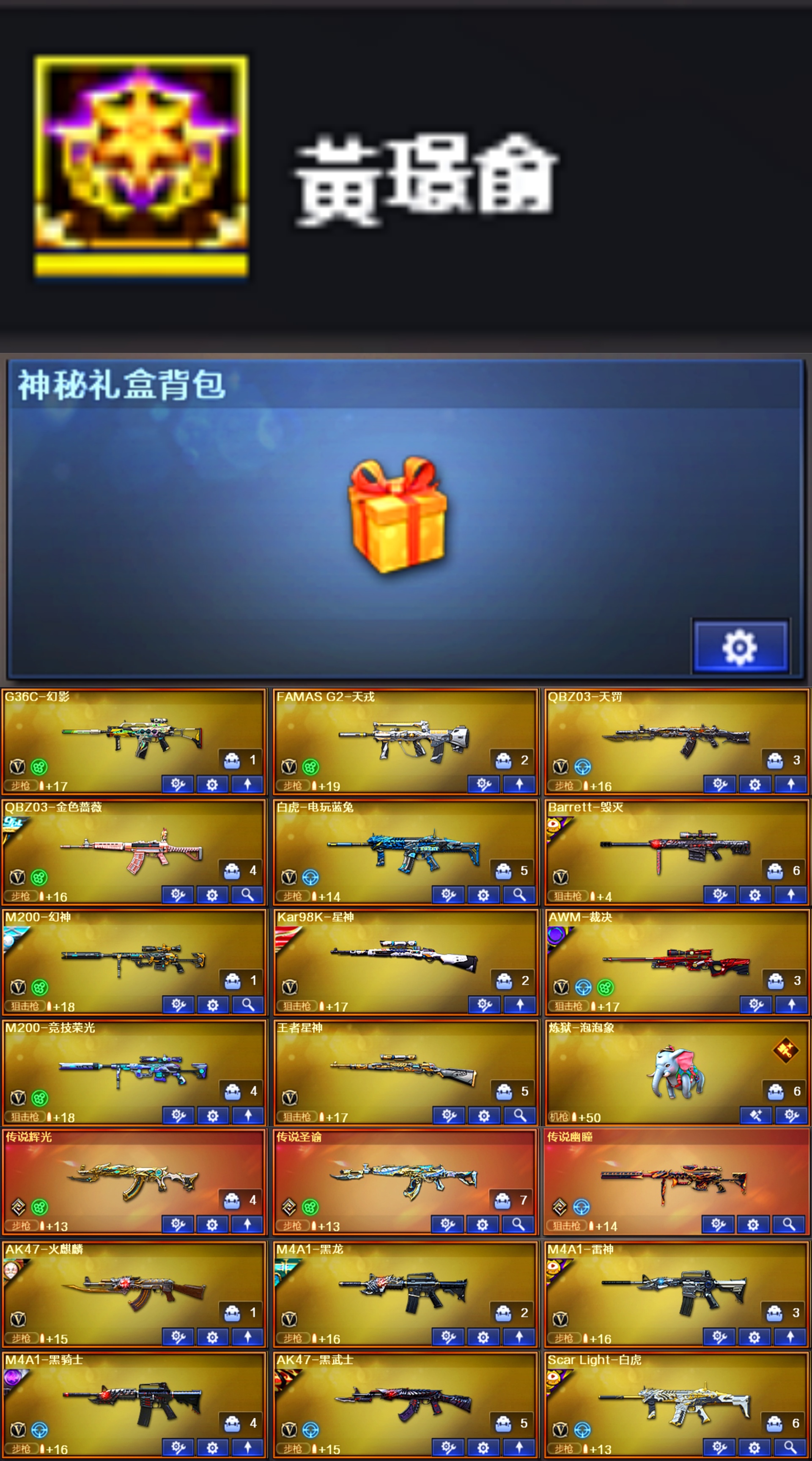 金名ID黃璟俞幽瞳圣谕幻影天戎泡泡象♥幻神音效卡7皮白鲨星火♥裁决音效卡2皮巅峰白虎白鲨巅峰QBZ冠