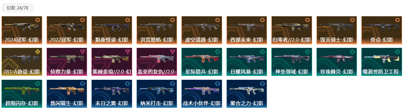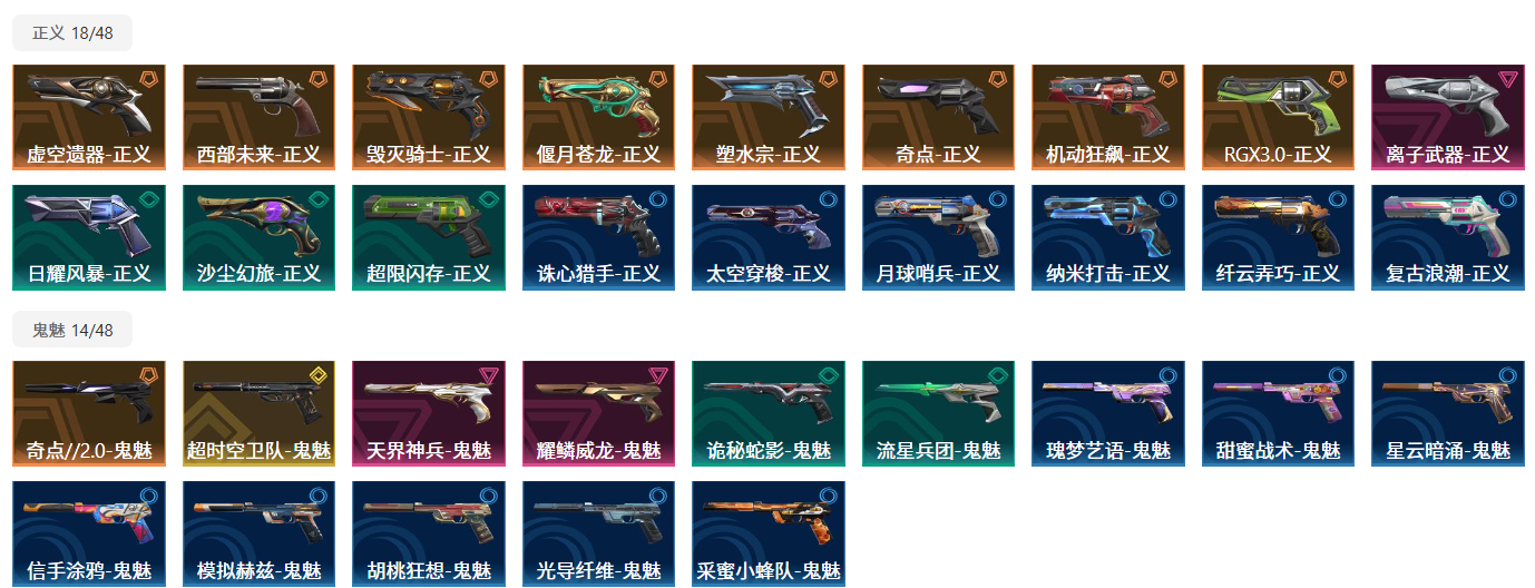 【拥有手枪】VCT-x-BBL-标配,毁灭骑士-正义,奇点-正义,离子武器-正义,星际猎兵-标配,阿特拉斯指挥部-标配,日耀风暴-正义,诡秘蛇影-鬼魅,神圣领域-狂怒,荒土机兵-标配,超限闪存-正义,超能偶像-标配,流星兵团-鬼魅,珍珠棘贝-狂怒,钢轨卫士-狂怒,钢轨卫士-短炮,沙尘幻旅-正义,弧光异彩-短炮,诛心猎手-正义,甜心猎手-短炮,瑰梦艺语-鬼魅,光环序列-狂怒,太空穿梭-正义,悠闲猫生-短炮,甜蜜战术-鬼魅,幻语魔咒-狂怒,末日之翼-短炮,折光棱晶-标配,星云暗涌-鬼魅,月球哨兵-正义,纳米-正义,逆冲蛮牛-狂怒,模拟赫兹-鬼魅,浮光跃金-标配,聚合之力-狂怒,采蜜小蜂队-鬼魅,纤云弄巧-正义,战术熊与伙伴们-标配,纤云弄巧-短炮,战术熊与伙伴们-狂怒,复古浪潮-正义,深海水族-短炮,光导纤维-鬼魅,光导纤维-标配,萌彩剪影-狂怒,胡桃狂想-鬼魅,彩梦之城-标配,信手涂鸦-鬼魅,