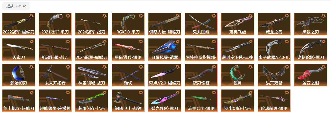 【拥有近战武器】星际猎兵-短剑,阿特拉斯指挥部-甩棍,日耀风暴-遗器,诡秘蛇影-军刀,神圣领域-战刀,荒土机兵-热能刀,超限闪存-匕首,超能偶像-应援棒,流星兵团-短剑,珍珠棘贝-短剑,钢轨卫士-战锤,沙尘幻旅-匕首,弧光异彩-军刀,镭切,落英飞旋,鬼丸国纲,盖亚之愠,侦察力量-蝴蝶刀,