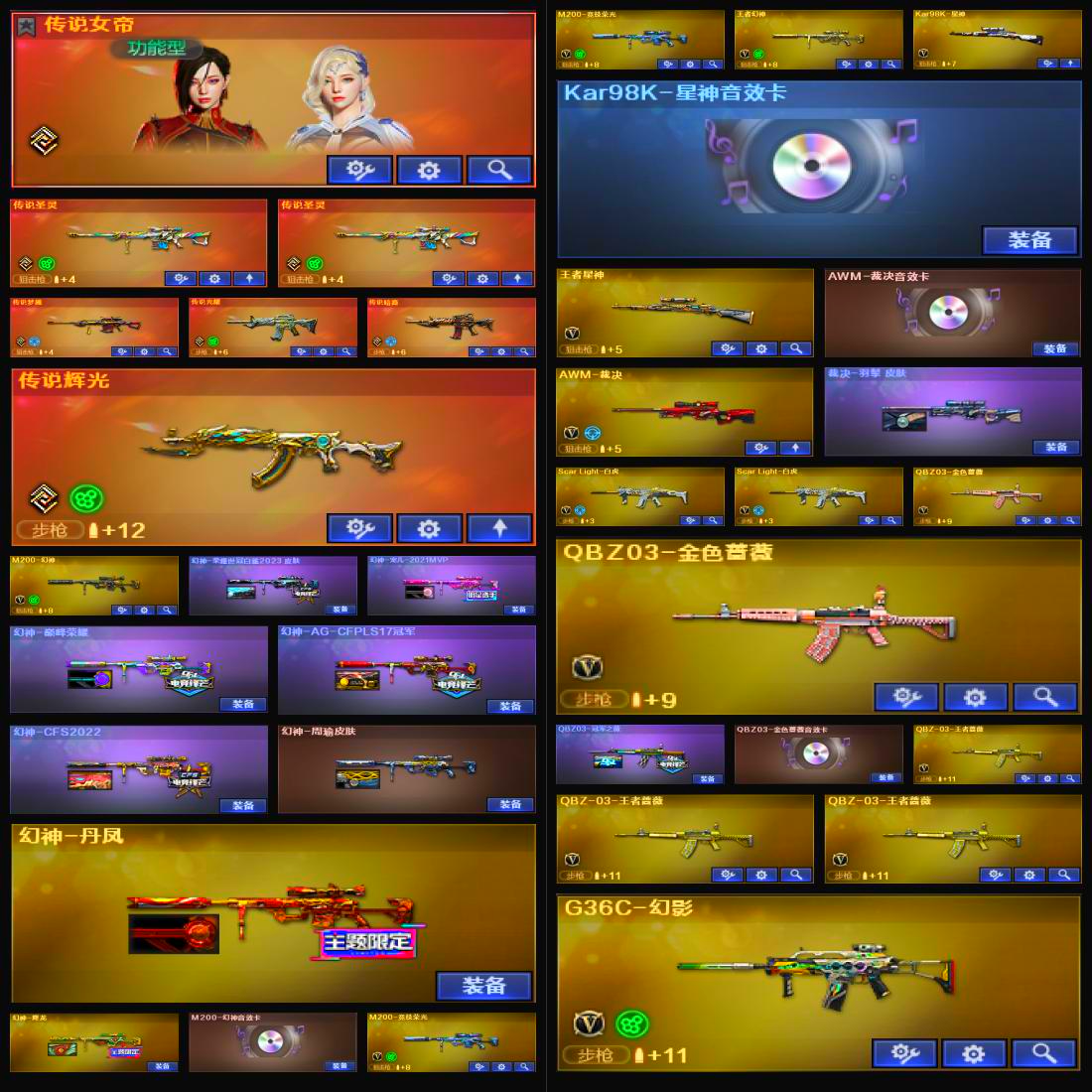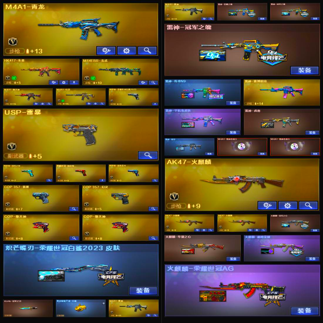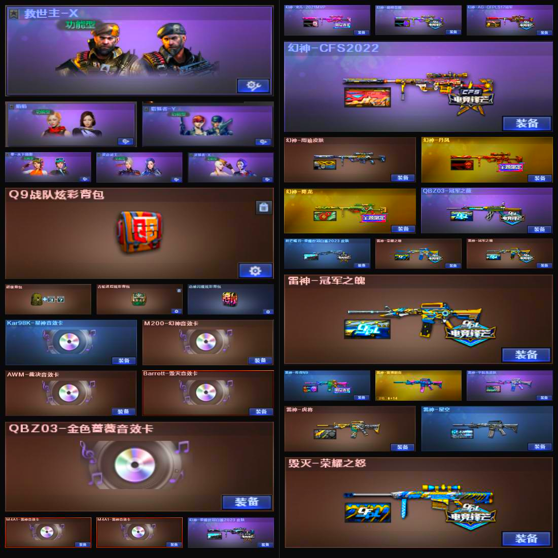 【幻神8皮三件套!!!】【金色蔷薇三件套!!!】【6传说武器+传说角色】 【M200幻神+幻神音效卡+宠儿皮肤+荣耀世冠白鲨2023皮肤+CFPLS17冠军皮肤+巅峰荣耀皮肤+CFS2022皮肤+降龙皮肤+周瑜皮肤+丹凤皮肤+usp雷暴+冠军之刃+4防传说女帝】 【98k星神+星神音效卡+王者星神】 【传说光耀 传说暗裔 传说辉光 传说圣灵*2 传说梦魇】【竞技荣光套装】 【7烈龙+8炼狱+盘龙+斯太尔蝴蝶】【白虎】 【qbz03金色蔷薇+金色蔷薇音效卡+冠军之薇皮肤】 【堕天神套装】 【幻灵套装】 【g36c幻影】 【王者冰魄 王者火魄 王者龙血 王者之魄 王者之烈 王者雷怒 王者森决 王者之决 王者之力】 【火麒麟+冠军之心皮肤+巅峰荣耀皮肤+荣耀世冠AG皮肤】 【雷神+雷神音效卡+冠军之魄皮肤+荣耀之魄皮肤+n9皮肤】 【黑骑士+伏羲皮肤+冠军之势皮肤】【毁灭+毁灭音效卡+CFS2018皮肤+冠军之怒皮肤+荣耀之怒皮肤】 【千变 无影 死神 黑武士 天启 超新星 黑鲨 龙血 青龙 朱雀 玄武 无影神兵利器 穹宇 9A91烈火 烈火动感闪耀 猩红传说 战士 巴雷特朱雀】——【冠军之特 usp雷暴 cop357雷霆 cop堕天神 cop357幻灵 沙鹰修罗 沙鹰天神 柯尔特荣耀世冠白鲨 天神动感闪耀 天神cf网局冠军武器套装 荣耀世冠柯尔特】——【冠军之刃 擎天 麒麟次 麒麟次堕天神 龙啸堕天神 幻灵之峰 擎天竞技荣光 王者之啸 王者之击 擎天cf网剧冠军武器套装 龙啸烈火龙威 王者冰峰】——【雷霆投掷武器套装 雷暴投掷武器套装 堕天神投掷武器套装*7 幻灵投掷武器套装*6 竞技荣光投掷武器套装*3 雷霆王者投掷武器套装】——【热门武器/小人枪】【苍鸣雷神 雷神小红 炫金火麒麟 炫金雷神 炫金骑士 财经雪莉杨 王者M200无畏金戈 炫金毁灭 水下丽影 黄金猫猫手套白鲨】——【角色】【4防(传说女帝 王者春 王者葵貂蝉 王者涂鸦 王者玲珑小乔)】【云悠悠 荒漠琉璃 鹰 迷迭香 零 影豹】;USP-雷暴,荣耀世冠-柯尔特,柯尔特-荣耀世冠白鲨2023,柯尔特-冠军之特,Knife-冠军之刃,传说女帝,电竞教官-云悠悠,