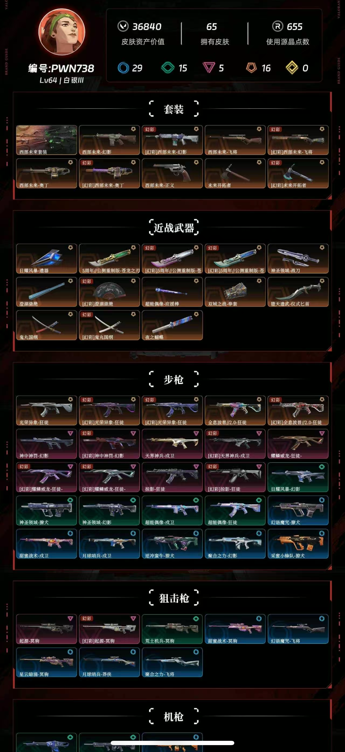 ✨冻结看wegame个人信息✨汤圆电竞✨解冻 【拥有套装】西部未来套装(西部未来-幻影,西部未来-奥丁,西部未来-飞将,西部未来-正义,未来开拓者) 【拥有近战武器】5周年//公测重制版-苍龙之刃,澄湖,双城之战-拳套,堕天遗武-仪式匕首,鬼丸国纲,夜之蝴蝶, 【拥有步枪】光荣异象-狂徒,全息波普//2.0-狂徒,神中神罚-幻影,天界神兵-戍卫,耀鳞威龙-狂徒-,掠影-狂徒 【拥有狙击枪】起源-冥驹,荒土机兵-冥驹 【稀有挂件】第九季青铜挂饰,双面黑猫挂饰 【卡面信息】捣蛋鬼出mo卡面;西部未来 奥丁,5周年//公测重制版 苍龙之刃,掠影 狂徒,天界神兵 戍卫,光荣异象 狂徒,起源 冥驹,西部未来 飞将,