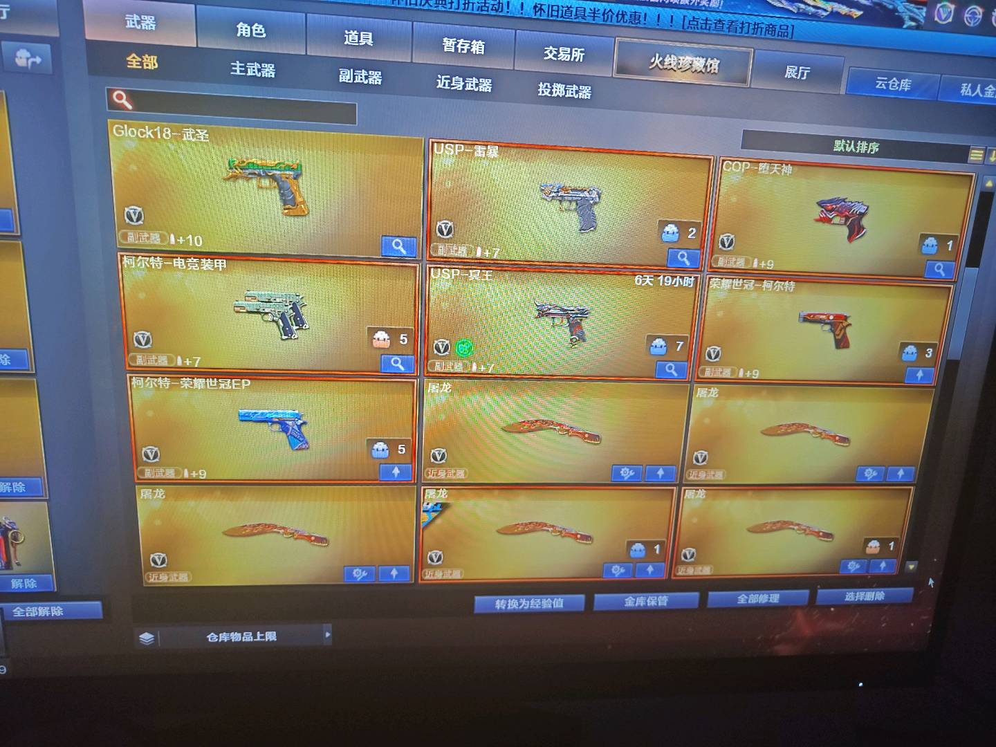 雷神冠军之魄+音效卡 QBZ金色蔷薇+ep 白虎+星神 毁灭极光三件套 幻神ep+音效卡 裁决三件套 副武器:USP cop ep科尔特 荣耀世冠科尔特 六烈六盘 人物:妮妮 春 王者春等四防 雷暴全套荣耀世冠全套ep全套 中途退排位拉入黑名单 此号已备案 封号报警处理(文明游戏谢谢配合);USP-雷暴,荣耀世冠-柯尔特,沙漠玫瑰,妮妮,RPK-盘龙,QBZ03-金色蔷薇,M200-幻神,