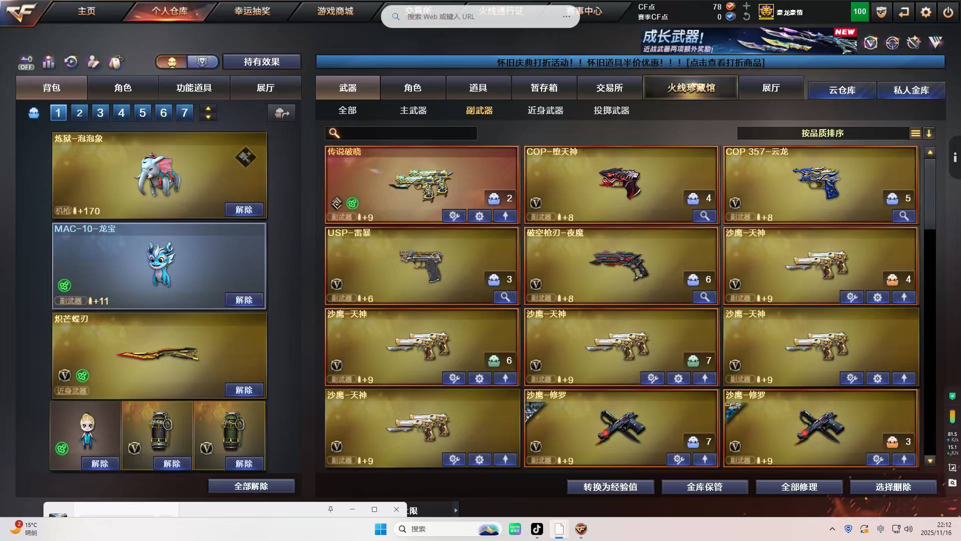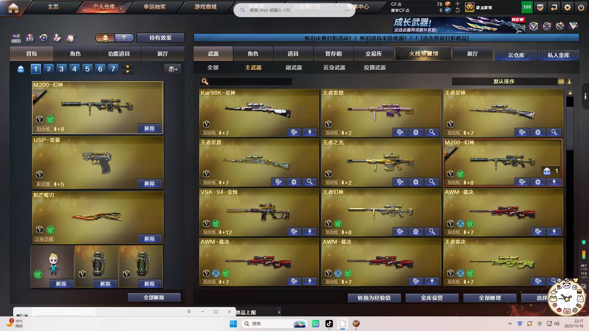 !!!!!!;USP-雷暴,炽芒蝶刃,传说影煞,RPK-盘龙,QBZ03-金色蔷薇,炼狱-泡泡象,M200-幻神,