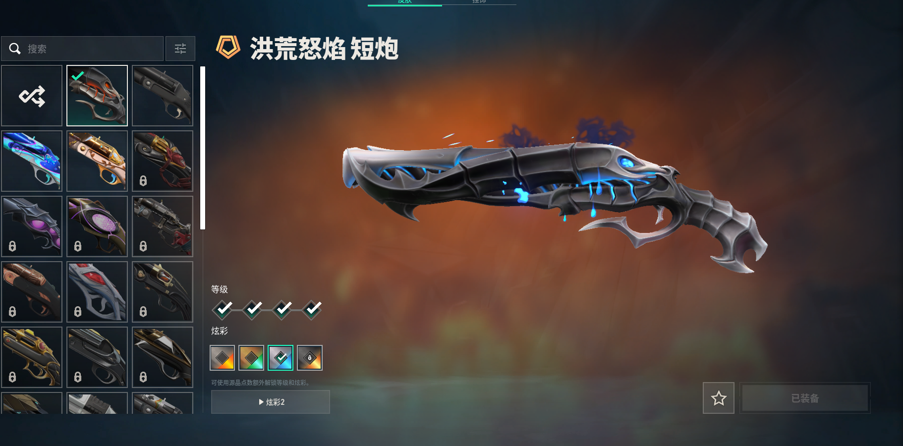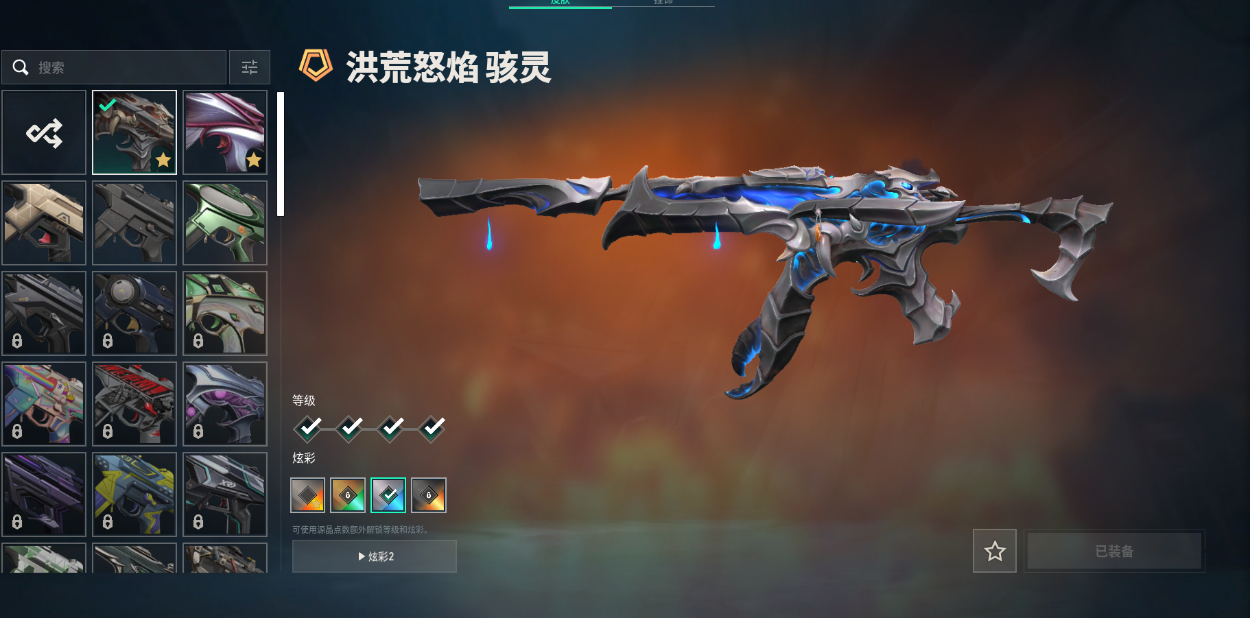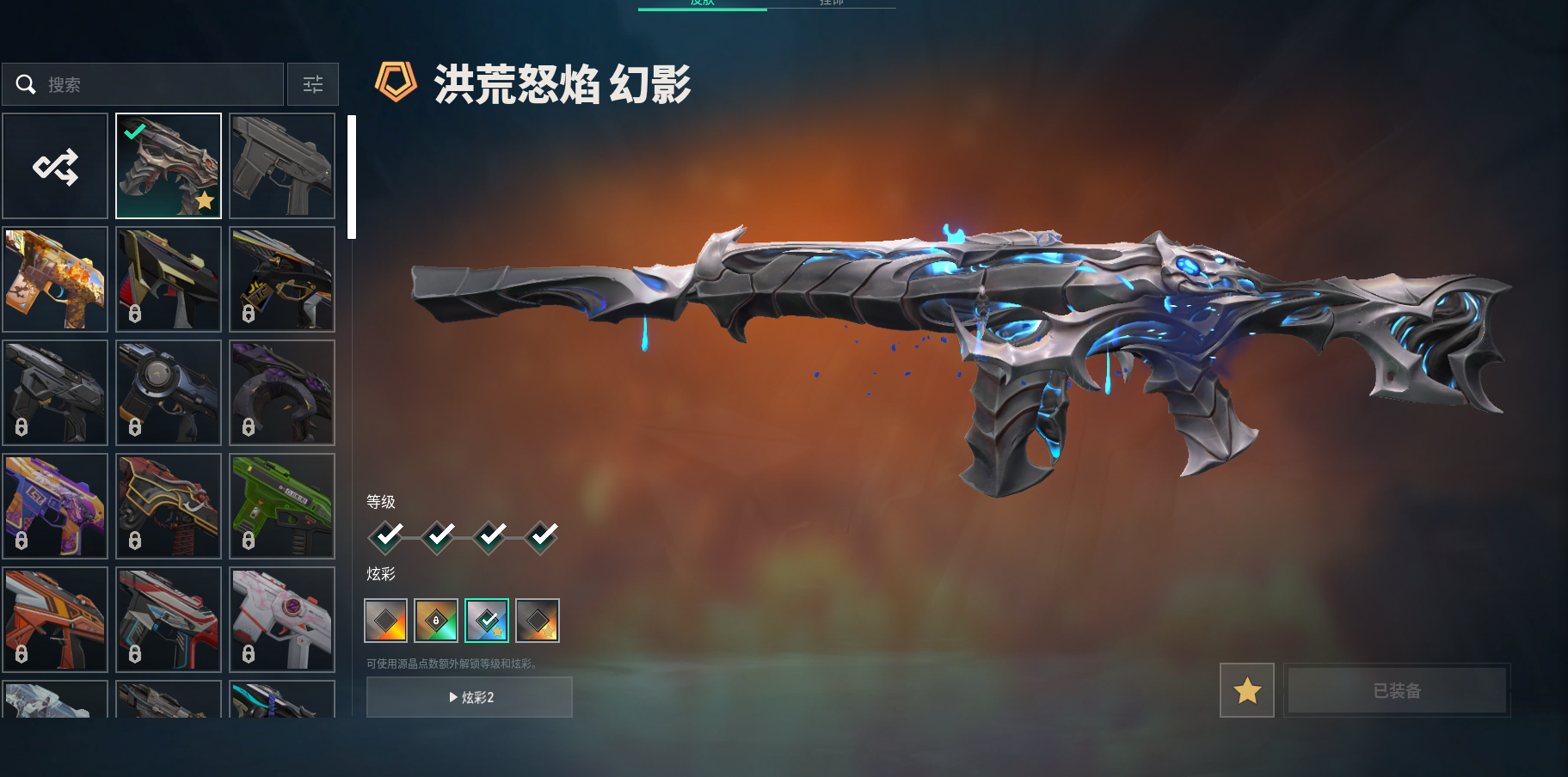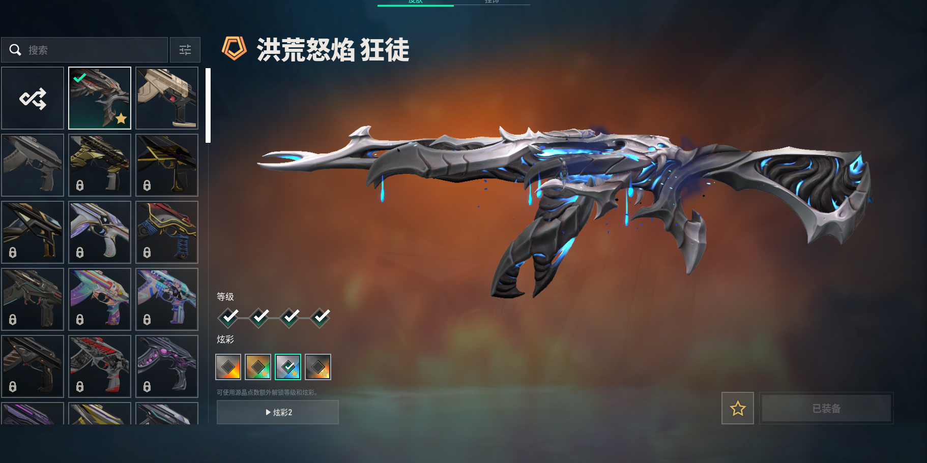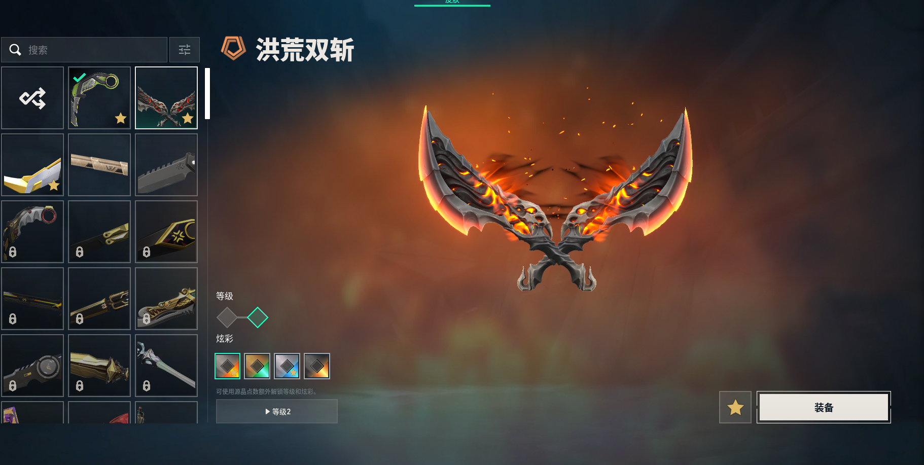 套装:洪荒怒焰套装| 洪荒怒焰套装:洪荒怒焰狂徒V4|洪荒怒焰幻影V4|洪荒怒焰短炮V4|洪荒怒焰骇灵V4|洪荒双斩V2| 其他皮肤:悠闲猫生幻影|珍珠棘贝戍卫|太空穿梭戍卫|悠闲猫生獠犬|复古浪潮獠犬|归零者冥驹V4|复古浪潮冥驹|深海水族莽侠|悠闲猫生飞将|复古浪潮雄鹿|太空穿梭判官|珍珠棘贝骇灵|无限竞技骇灵|深海水族蜂刺|太空穿梭战神|深海水族战神| 近战武器:洪荒双斩|紫金爪刀|显卡爪刀;紫金爪刀,洪荒怒焰 狂徒,洪荒怒焰 幻影,归零者 冥驹,盖世英雄 鬼魅,