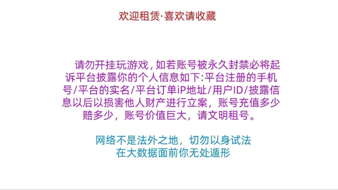 郑重声明 ✨本人商户多年 所属所有账号均在派出所备案 若出现 账号封禁/毁号等情况会直接联系平台取得联系 平台会直接联系当地派出所报案! 请租客文明游戏 不要开挂或挂机! ✨!开挂导致10年必追究 不拿到补偿不罢休!✨ 老板们炸鱼别杀50个 不然账号会被游戏直接冻结 祝老板们天天开心 愉快游玩 收藏到时间不下线;盖亚的复仇 狂徒,洪荒怒焰 幻影,RGX 11z Pro 狂徒,天界神兵 戍卫,堕天遗武 狂徒,塑水宗 狂徒,堕天遗武 冥驹,