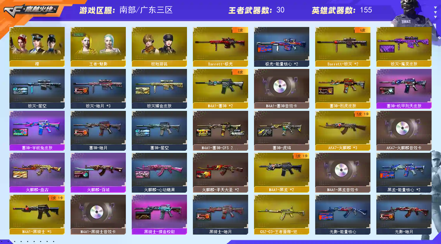 6烈蝴蝶+6潘炼狱+幻神带周瑜皮带音效卡+雷神带三皮带音效+火麒麟盘古带音效+黑骑士带音效+黑龙带音效+王心,王者蔷薇,王火魄,王冰魄 雷霆王者套+幻灵套+堕天套+竞技荣光套,生化专用人物沙漠玫瑰;USP-雷暴,沙漠玫瑰,电竞教官-云悠悠,RPK-盘龙,QBZ03-金色蔷薇,M200-幻神,Scar Light-白虎,