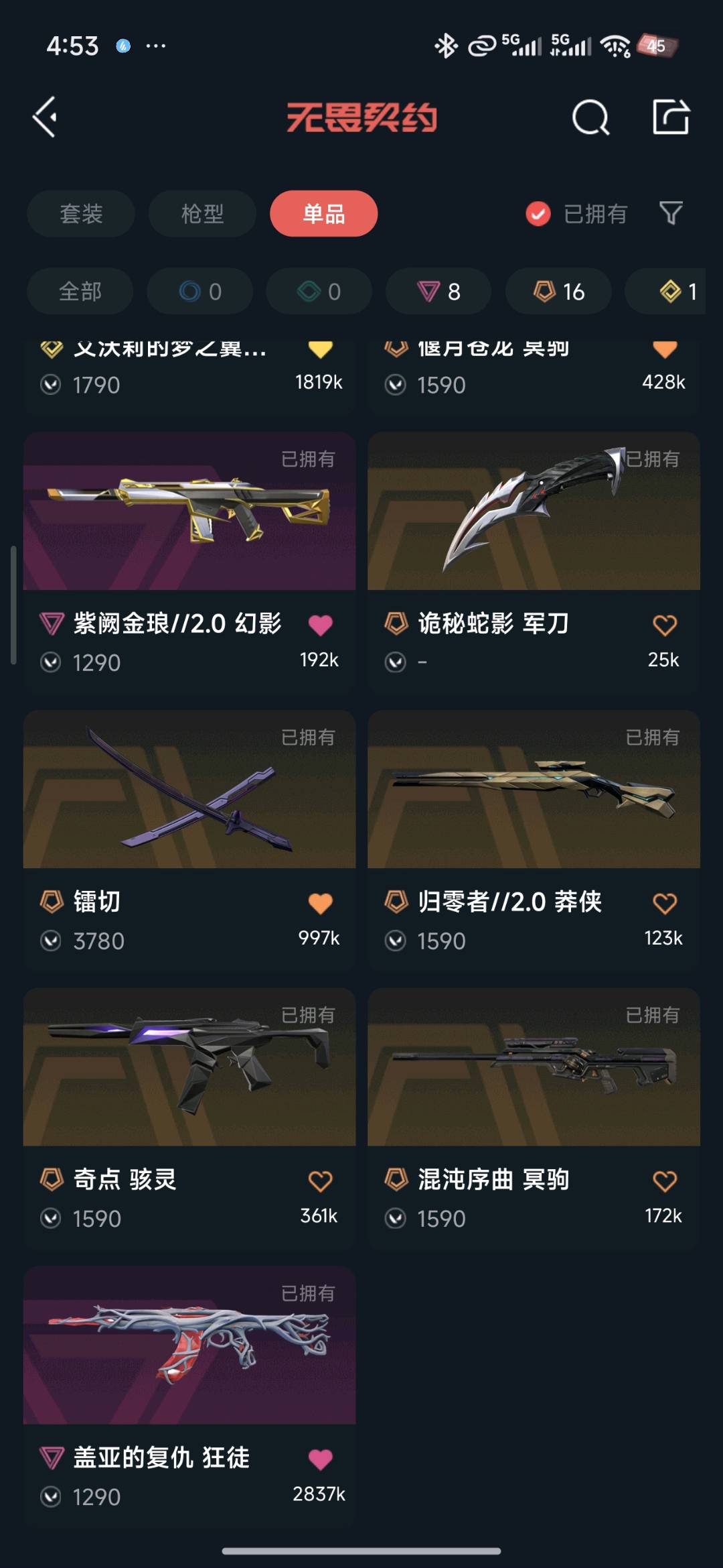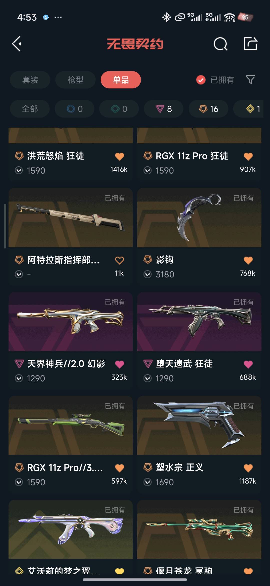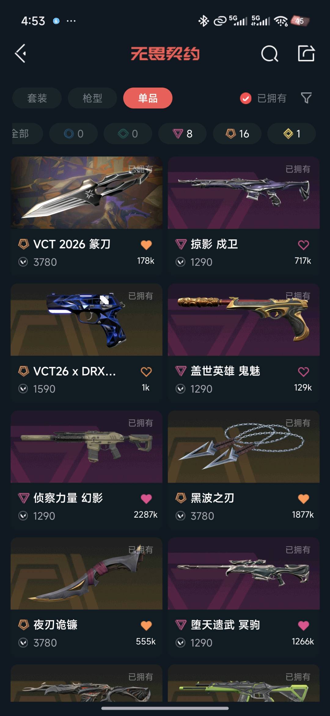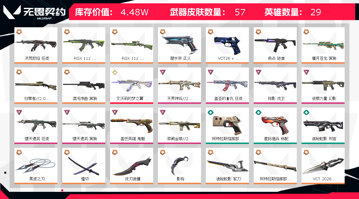 首页 > 租号大厅 > 无畏契约-wegame > wegame/wegame > 全英雄.皮肤55.黑波之刃,掠夺爪,26篆刀,26VCT标配,其余枪皮自查图片