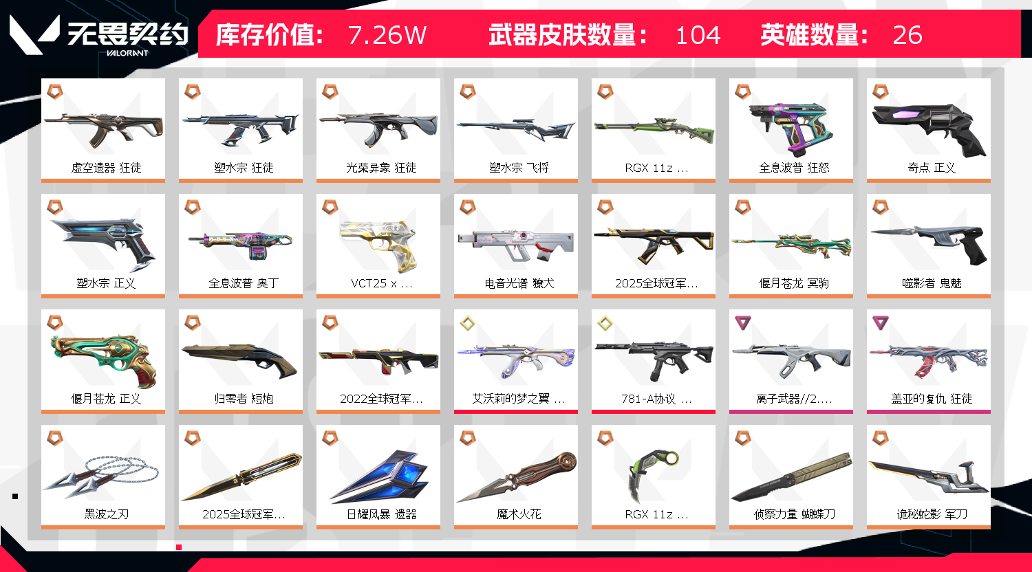 近战武器-2025全球冠军赛蝴蝶刀,近战武器-2022全球冠军赛蝴蝶刀,近战武器-显卡3.0爪刀,近战武器-魔术火花,近战武器-奇点2.0蝴蝶刀,近战武器-侦察力量蝴蝶刀,近战武器-天御刀,近战武器-黑波之刃,近战武器-诡秘蛇影军刀,近战武器-日耀风暴遗器,近战武器-阿特拉斯指挥部甩棍,近战武器-星际猎兵短剑,近战武器-碎心裂刃; 【枪皮】:标配-VCT25xTH,狂徒-2025全球冠军赛,幻影-2022全球冠军赛,鬼魅-噬影者,正义-奇点,正义-塑水宗,正义-偃月苍龙,短炮-归零者,狂怒-全息波普,狂徒-塑水宗,狂徒-虚空遗器,狂徒-光荣异象,獠犬-电音光谱,冥驹-偃月苍龙,飞将-塑水宗,莽侠-显卡3.0,奥丁-全息波普,骇灵-781-A协议,狂徒-艾沃莉的梦之翼,鬼魅-耀鳞威龙,鬼魅-掠影2.0,骇灵-海洋之星,狂徒-离子武器2.0,狂徒-盖亚的复仇,狂徒-堕天遗武,幻影-侦察力量,幻影-紫阙金琅2.0,戍卫-天界神兵,戍卫-紫阙金琅,战神-离子武器2.0,标配-星际猎兵,鬼魅-诡秘蛇影,骇灵-无限竞技,判官-星际猎兵,判官-诡秘蛇影,狂徒-诡秘蛇影,幻影-星际猎兵,飞将-星际猎兵,莽侠-诡秘蛇影,正义-游戏结束,狂徒-幻心猎手,狂徒-阿特拉斯指挥部,幻影-日耀风暴,莽侠-阿特拉斯指挥部,正义-日耀风暴,鬼魅-幻心猎手,标配-阿特拉斯指挥部,骇灵-阿特拉斯指挥部,骇灵-日耀风暴,奥丁-日耀风暴,狂徒-瑰梦艺语,幻影-甜心猎手,幻影-悠闲猫生,幻影-末日之翼,戍卫-甜心猎手,戍卫-光环序列,戍卫-太空穿梭,戍卫-甜蜜战术,戍卫-折光棱晶,獠犬-诛心猎手,獠犬-悠闲猫生,獠犬-幻语魔咒,冥驹-诛心猎手,冥驹-光环序列,冥驹-甜蜜战术,莽侠-甜心猎手,飞将-悠闲猫生,飞将-幻语魔咒,飞将-末日之翼,正义-诛心猎手,正义-太空穿梭,鬼魅-瑰梦艺语,鬼魅-甜蜜战术,标配-折光棱晶,短炮-甜心猎手,短炮-悠闲猫生,短炮-末日之翼,狂怒-光环序列,狂怒-幻语魔咒,骇灵-瑰梦艺语,蜂刺-甜心猎手,蜂刺-折光棱晶,判官-太空穿梭,判官-甜蜜战术,雄鹿-瑰梦艺语,雄鹿-幻语魔咒,奥丁-诛心猎手,奥丁-末日之翼,战神-光环序列,战神-太空穿梭;【热门;黑波之刃,盖亚的复仇 狂徒,虚空遗器 狂徒,侦察力量 幻影,天界神兵 戍卫,堕天遗武 狂徒,塑水宗 狂徒,