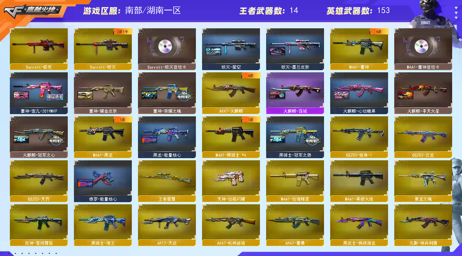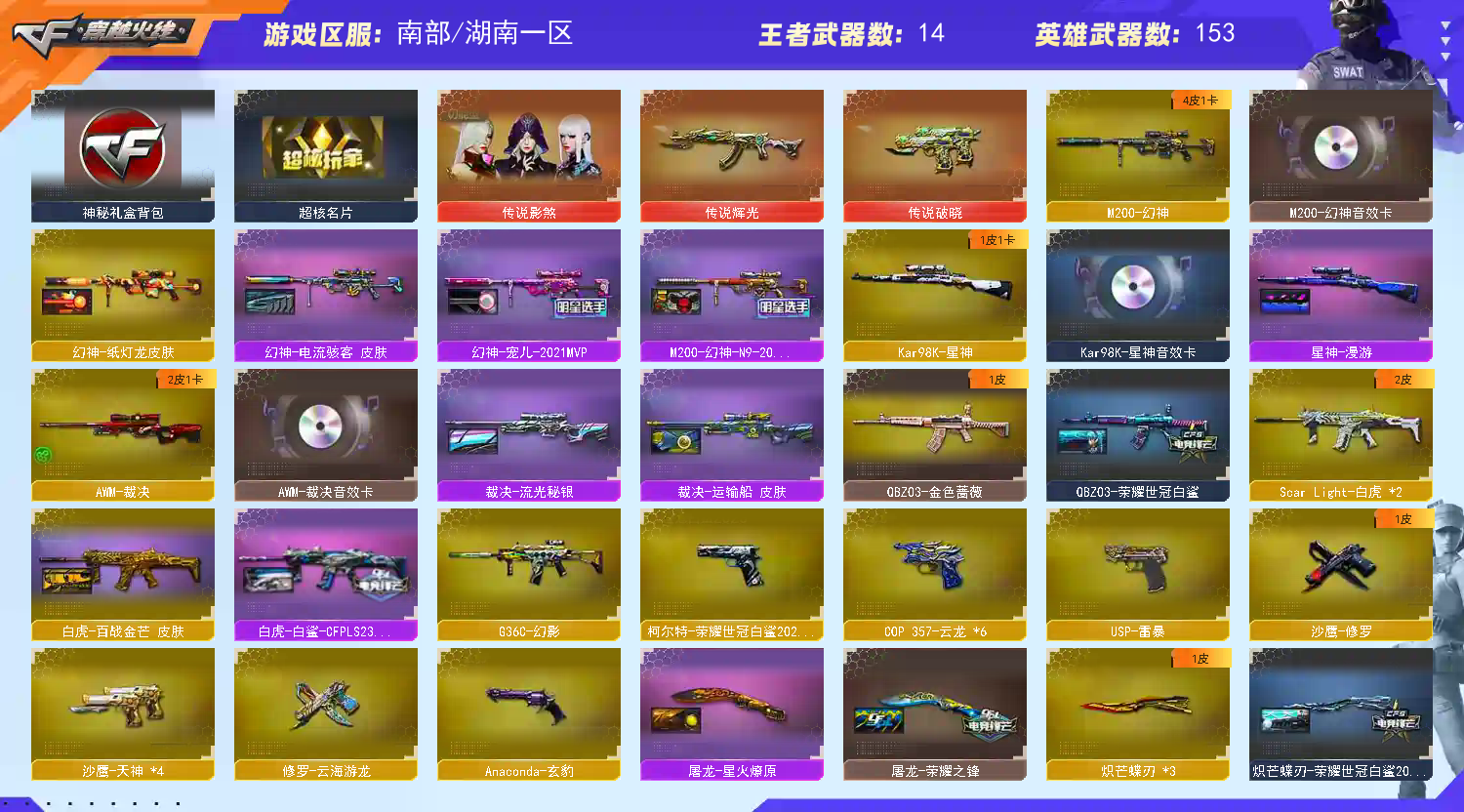 传说影煞+传说辉光+传说破晓+王者-瞳-闭月羞花+王者-零-国色天香+王者之势-觉醒版+王者之武-觉醒版+王者之翼-觉醒版+王者之魄-觉醒版+王者星霆+王者猎神-觉醒版+王者玄武+青龙之魄+炫金毁灭+炫金骑士+司雨+机械姬+晴雅+荒漠琉璃+雨棠+G36c-幻影+scar Light-白虎x2+八面玲珑+QBZ03-金色蔷薇+QBZ03-云龙+QBZ03-天罚+9A91-烈火+AK12-天启+AK47-机械迷城+AK47-火麒麟+AK47-雷暴+AN94-超新星+HK417-朱雀+M4A1-死神+M4A1-猎神x2+M4A1-玫瑰精灵+M4A1-雷神+M4A1-雷神+M4A1-黑骑士x4+M4A1-黑龙+无影-神兵利器+烈火-动感闪耀+黑骑士-锦绣游龙+黑骑士-海王+Anaconda-玄豹+沙影-修理+柯尔特-荣誉世冠白鲨2023+天神-动感闪耀+修罗-云海游龙+USP-雷暴+沙鹰-天神x4+COP 357-云龙x6+Barrett-极光+Barrett-毁灭+Barrett-金色蔷薇+M200-幻神+Kar98k-星神+AWM-裁决+AWM-天龙+汤姆逊-烈龙x5+烈龙-汤姆逊+RPK盘龙x6+加特林-炼狱+炼狱-百战金芒+清道夫-蛇影双姣+斯泰尔-蝴蝶+生存之眼+宙斯+炽芒蝶刃x3+丛林匕首-玄豹+云龙扇x3+屠龙+屠龙-动感闪耀+擎天+擎天-云海游龙+斩神刀-雷暴+麒麟刺+尼泊尔-雷霆+麒麟刺-百战金芒+龙啸+龙啸-烈火龙威+手雷-云海游龙+手雷-动感闪耀+烟雾弹-云龙x2+烟雾弹-幻灵+烟雾弹-玄豹x4+烟雾弹-神工天巧x2+烟雾弹-雷暴x6+闪光弹-云龙x2+闪光弹-玄豹x5+闪光弹-神工天巧+闪光弹-雷暴x8+闪光弹-雷霆+高爆手雷-云龙x2+高爆手雷-玄豹x7+高爆手雷-神工天巧+高爆手雷-雷暴x7+高爆手雷-雷霆x3+AWM-裁决音效卡+Barrett-毁灭音效卡+加特林-音效卡+QBZ03-天罚音效卡+Kar98K-音效卡+M200-幻神音效卡+M4A1-雷神音效卡+裁决-流光秘银-皮肤+幻神-宠儿-2021皮肤+炽芒蝶刃-世冠荣耀白鲨2023皮肤+QBZ03-荣耀世冠皮肤+雷神-宠儿-2019MVP皮肤+星神-漫游皮肤+炼狱钟馗皮肤+超核玩家+神秘礼盒-炫彩背包;USP-雷暴,柯尔特-荣耀世冠白鲨2023,炽芒蝶刃,传说影煞,晴雅,RPK-盘龙,QBZ03-金色蔷薇,