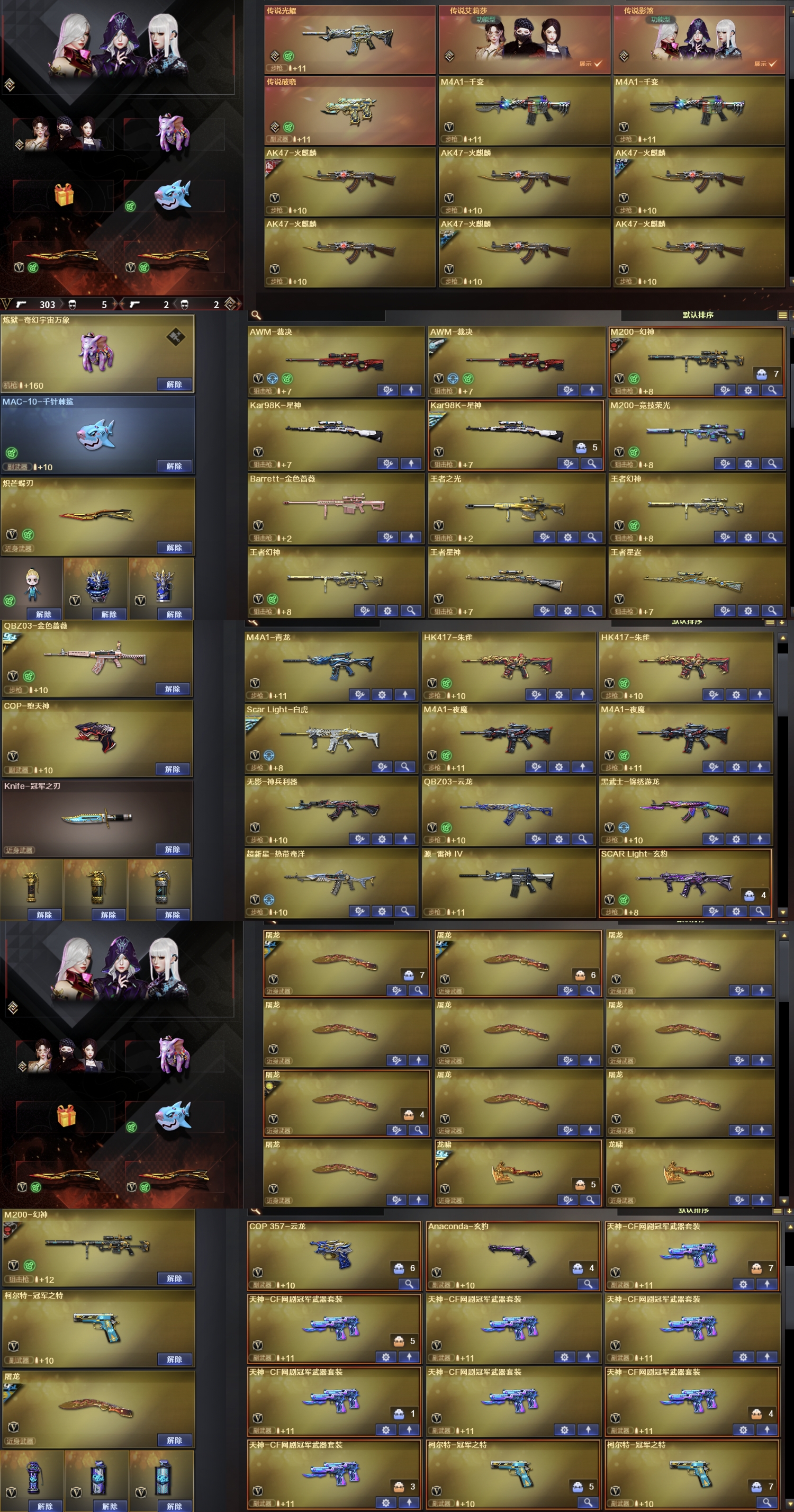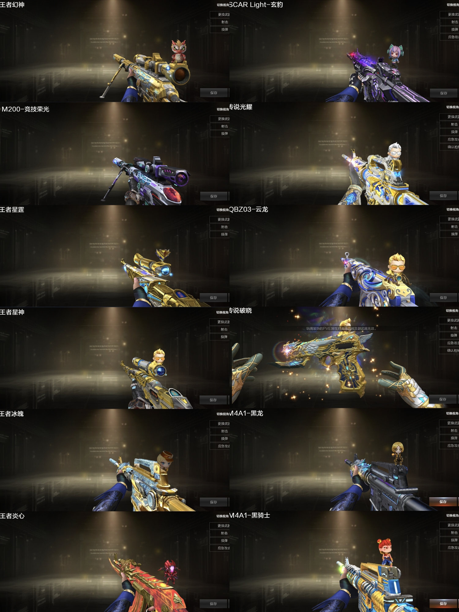 传说影煞4防,传说艾丽莎4防,幻神N9三件套,裁决三件套,极光三件套,QBZ冠军之薇三件套,白虎冠军,2018套,炼狱泡泡象6盘6烈蝴蝶毒蜂,2炽芒叠刃,神秘背包 USP冥王;USP-雷暴,柯尔特-冠军之特,炽芒蝶刃,Knife-冠军之刃,传说影煞,电竞教官-云悠悠,王者沙漠玫瑰,